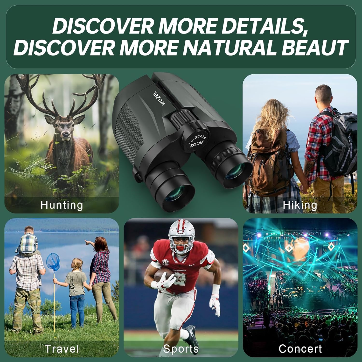 【10-30×25 High Magnification Zoom Binoculars】The powerful binoculars for adults and kids have a 25mm objective lens and 18mm eyepiece, featuring 10-30x magnification. The zoom binoculars allows for observation over a range of distances. Observe more of the view with the lightweight binoculars for a better birds watching experience for you and your family.