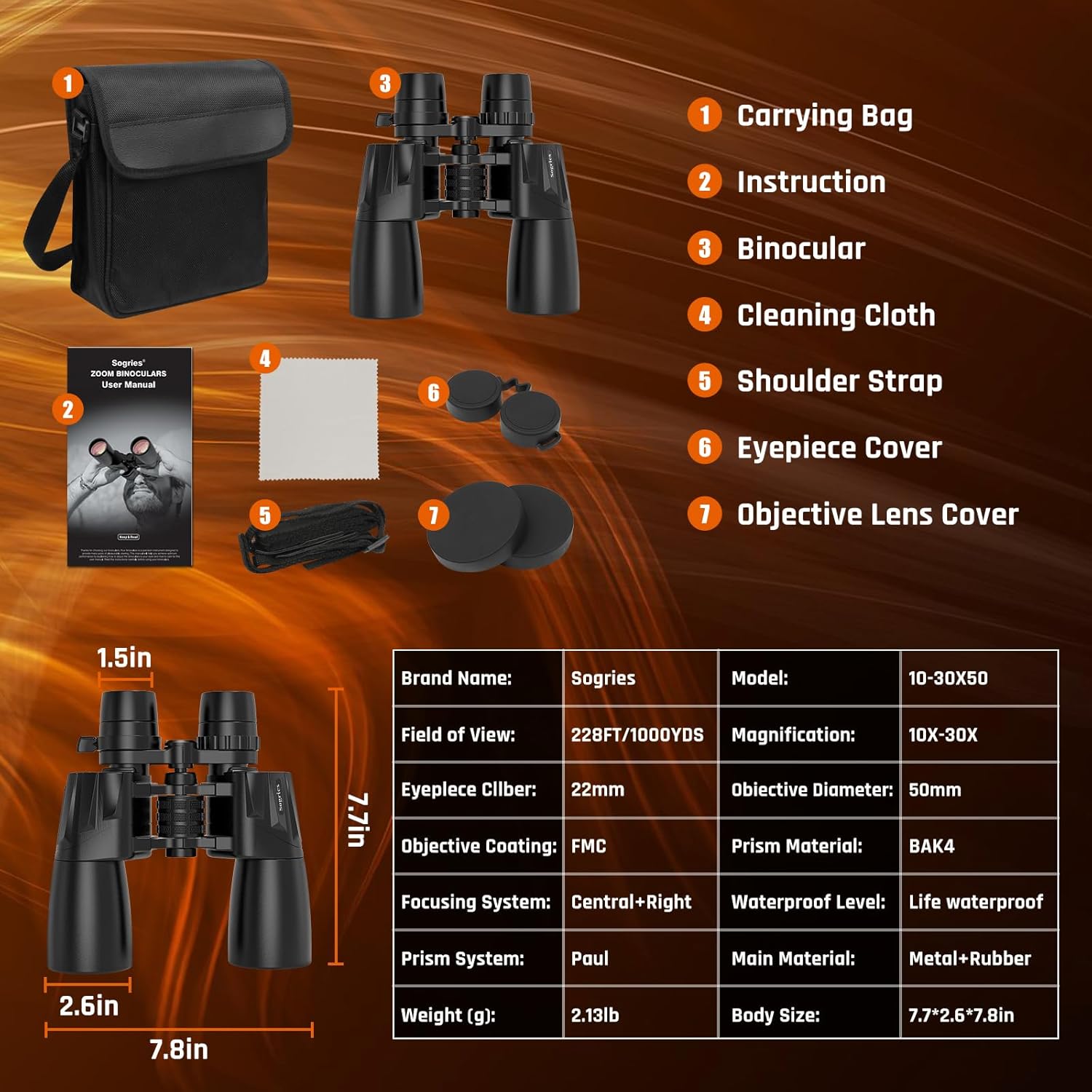 High Power Zoom Binoculars–Professional 10-30×50 zoom binoculars with a 50mm big eyepiece and 10-30X magnification let you focus on the target for excellent details from 235 feet or 1000 yards away. Our powerful binoculars provide a bright, sharp, and vibrant image with more true-to-life details, making them ideal for outdoor activities like hiking, driving, and wildlife and scenic viewing. It works well for large-scale theatre productions, concerts, football games, etc.