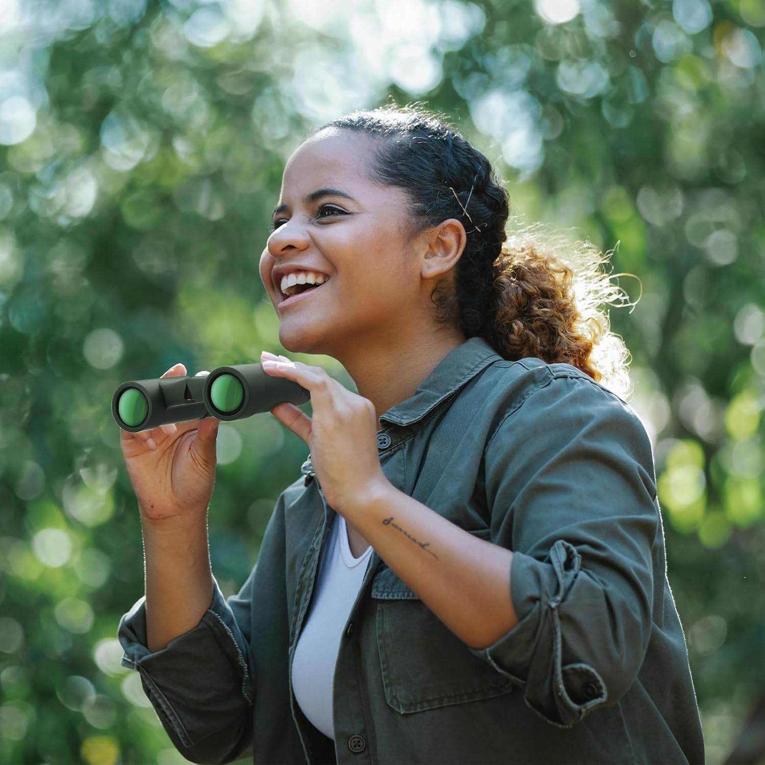 【HIGH-CONTRAST BINOCULARS FOR BIRD WATCHING】Experience high color fidelitybinoculars for bird watching that ensure no details are lost, even in the deepest twilight. Theseadvanced birding binoculars are equipped with fully multi-coated lenses and high-resolution phase-corrected BAK4 roof prisms, quaranteeing high-contrast images with incredible color fidelity. You candiscern every detail for quick and easy identification in any bird-watching scenario you encounter.