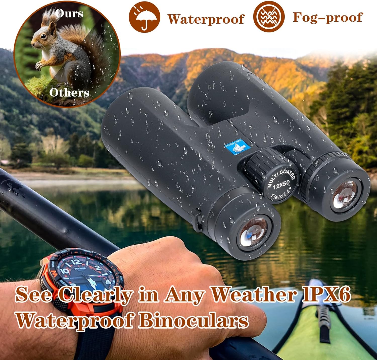 12x Magnification & 50mm Objective Lens for Ultra-Clear, Long-Range Viewing – With a 12x magnification and a 50mm objective lens, these binoculars for adults deliver exceptionally sharp, clear views, allowing you to observe distant objects with precision. Ideal for birdwatching, hiking, hunting, and wildlife observation, it ensures you capture every detail with bright, vivid imagery.