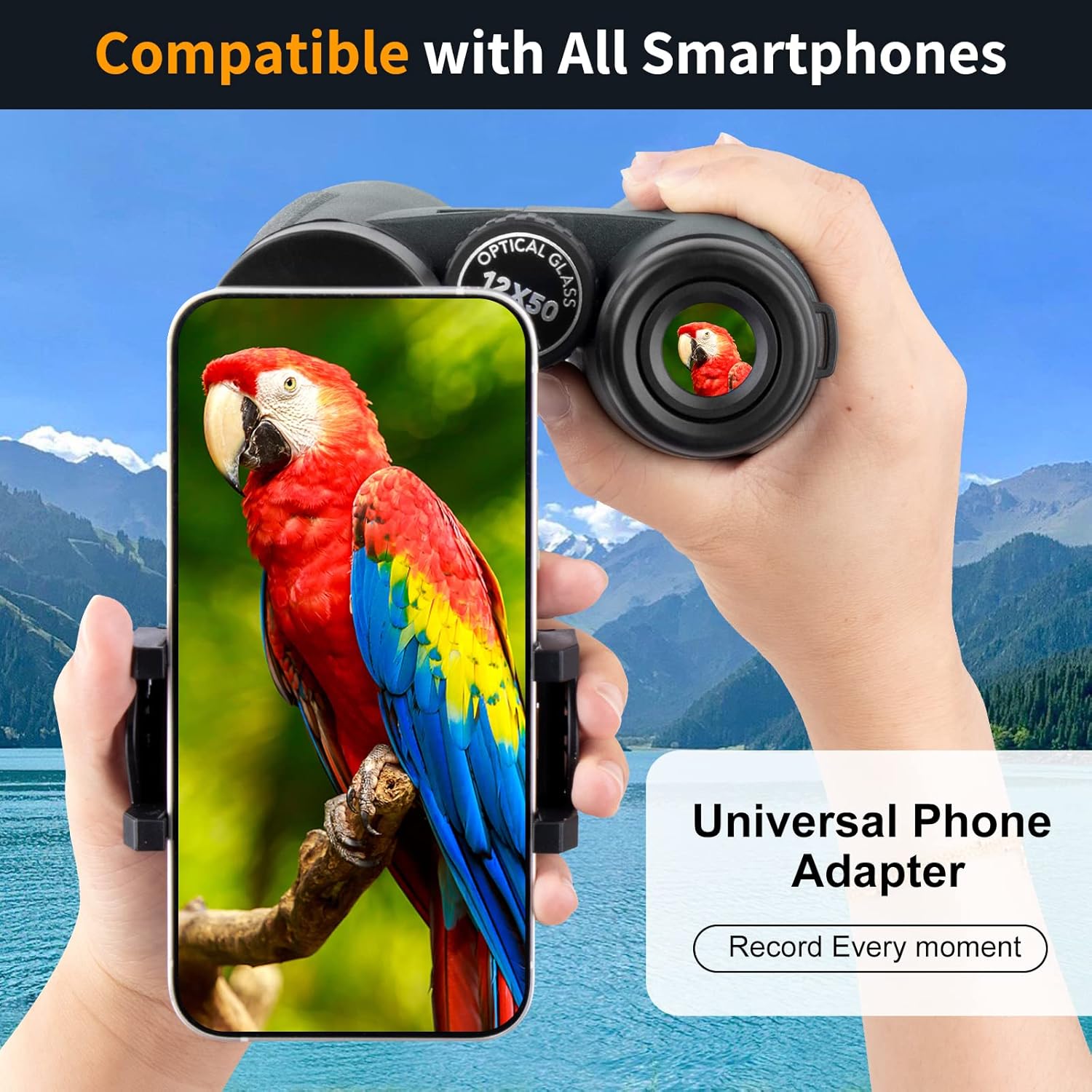 ⭐【Upgraded Universal Phone Adapter & Carrying Case】Bird watching binoculars for adults are suitable for all kinds of smartphones with or without cases, including but not limited to iPhone, Samsung, Sony, Google, LG, Motorola, HTC, etc. A carrying bag, lens cap, cleaning cloth and neck strap are also included for convenience.