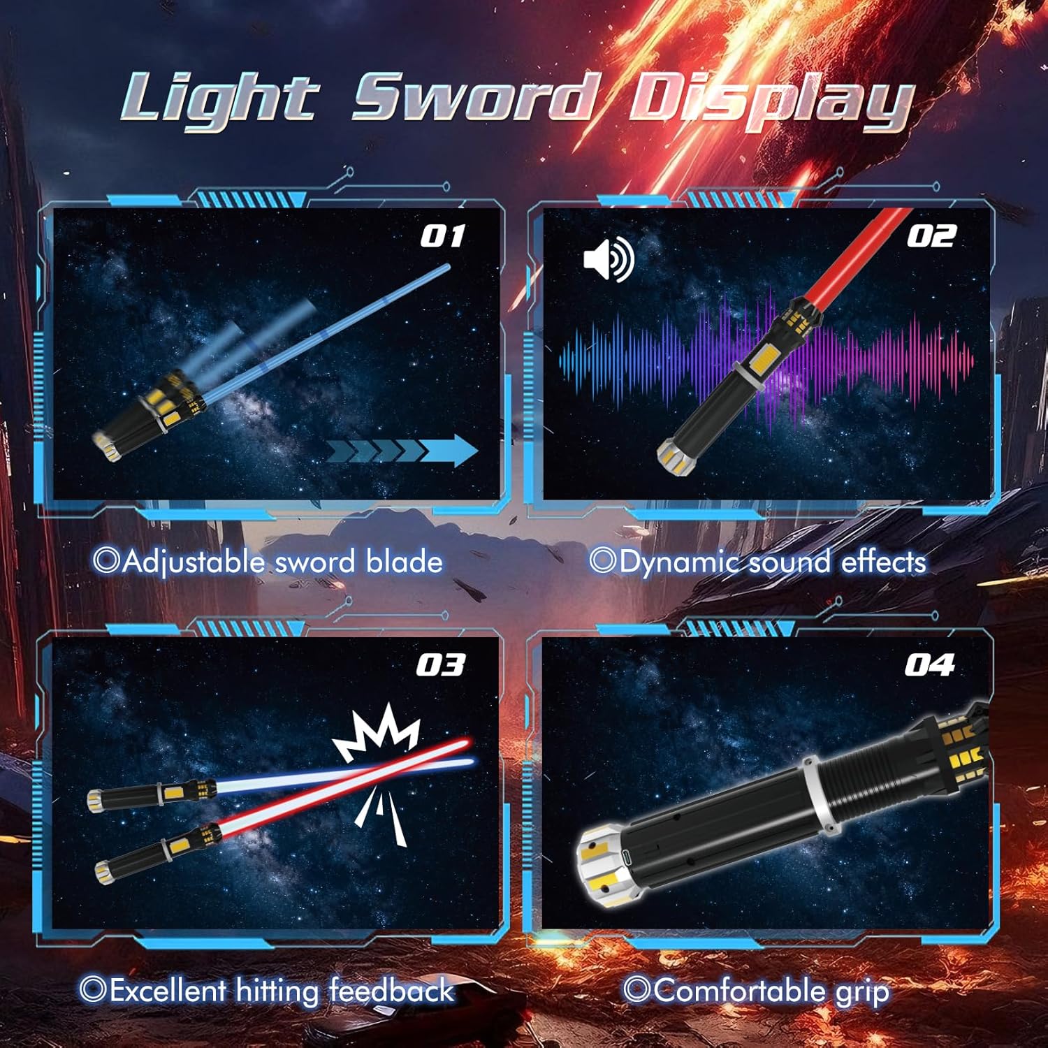 Immersive Combat Experience: Press the button once to turn on bright lighting and authentic sound effects, press again to mute. Continuous hit can trigger 4 dynamic sound effects, creating a vivid dueling experience.