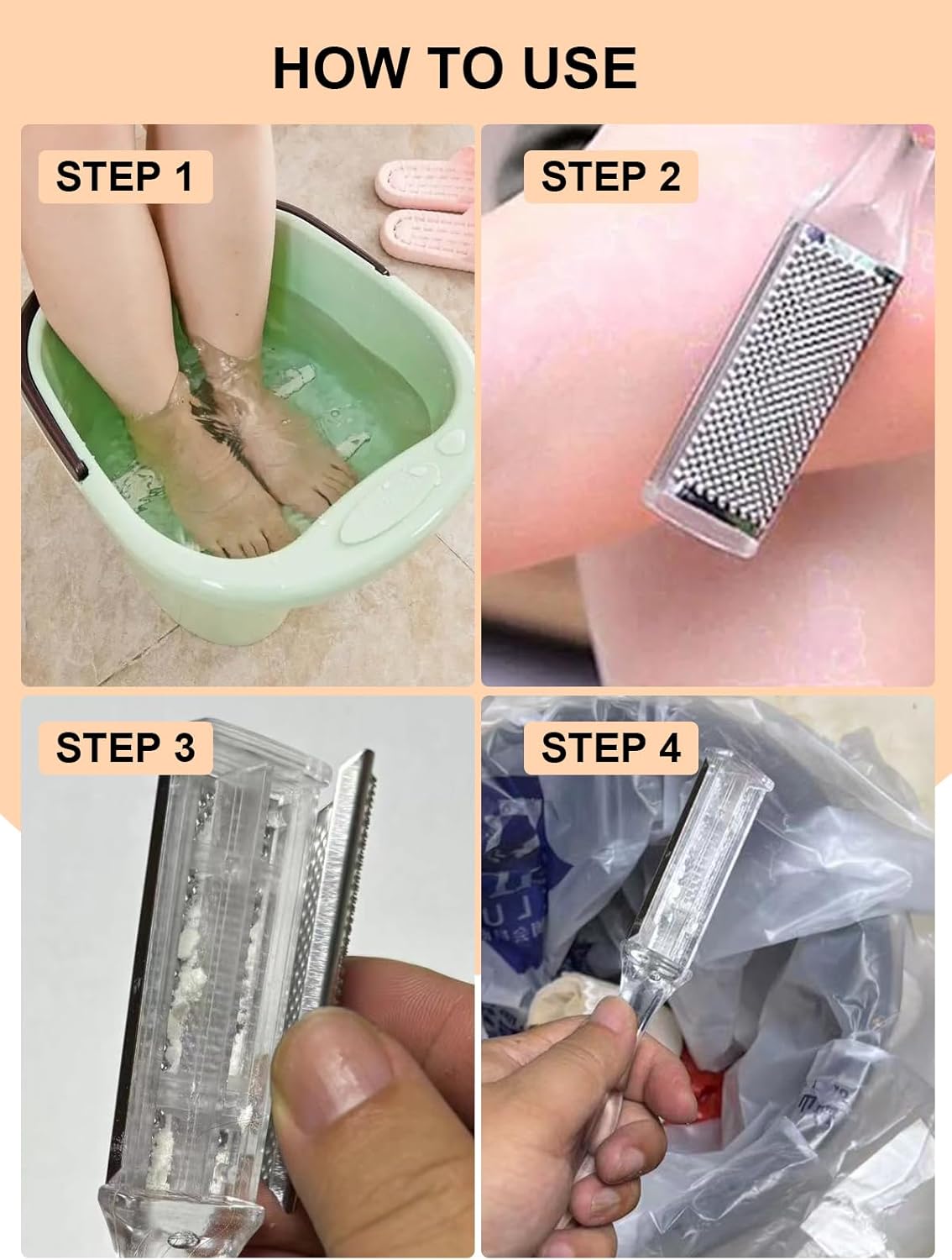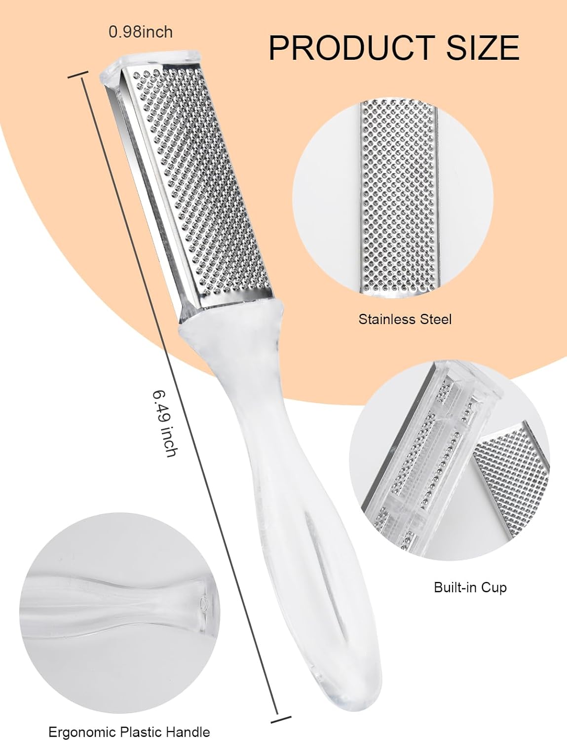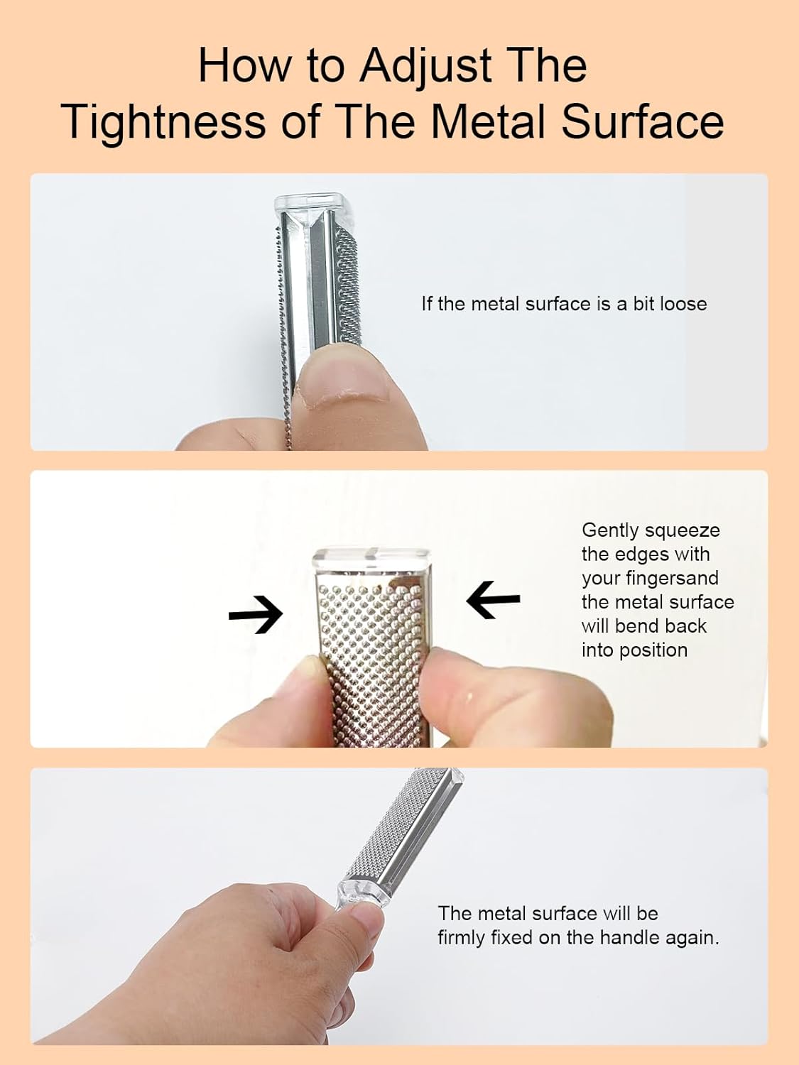 【Mess-Free】:Our foot file has a storage compartment that collects the skin shavings. When you’re finished, just dump them into the trash can! Warm Tips:If you notice the metal surface on your foot file is a bit loose, just gently squeeze the edges with your fingers to secure it back in place. The metal surface will bend back into position and be firmly fixed on the handle again.