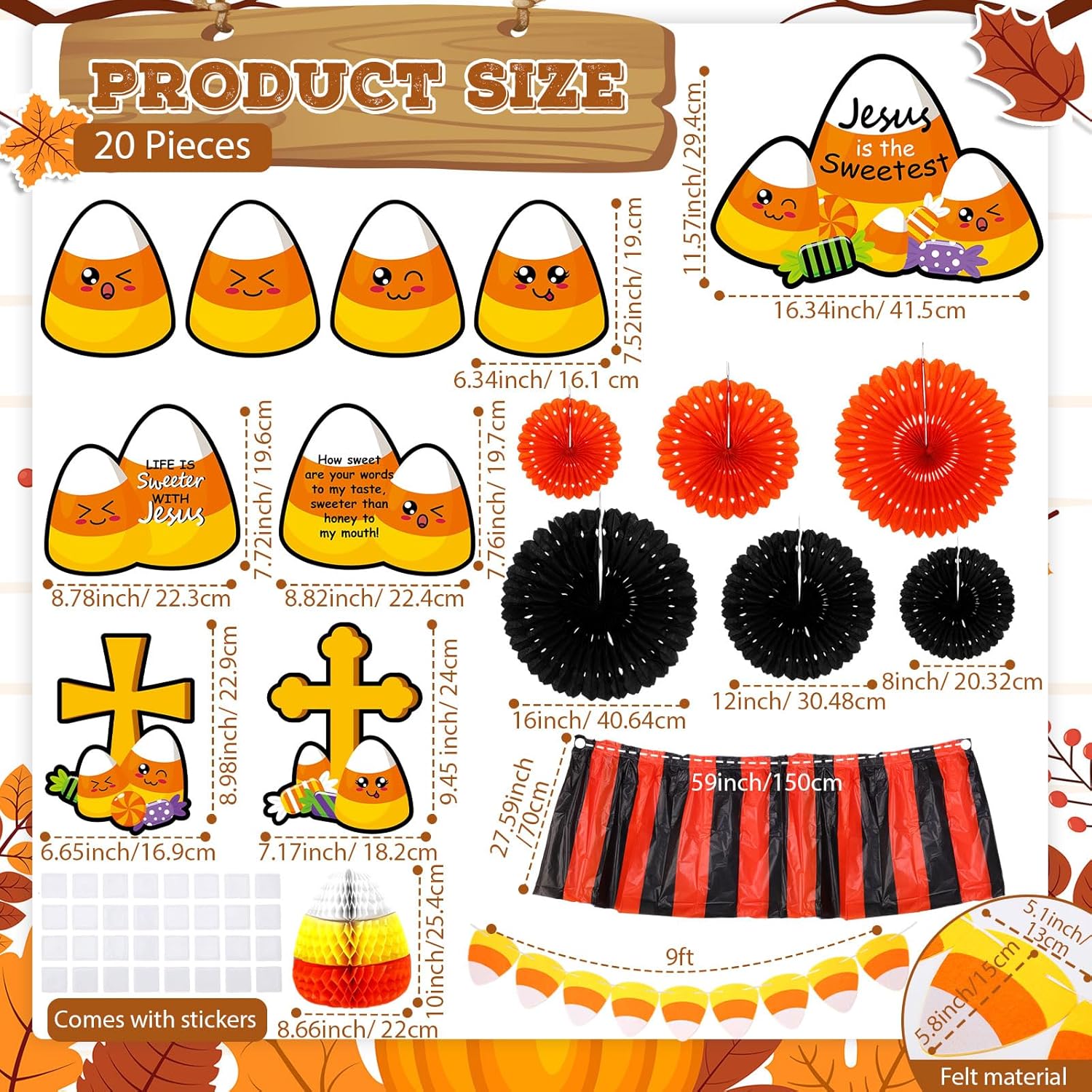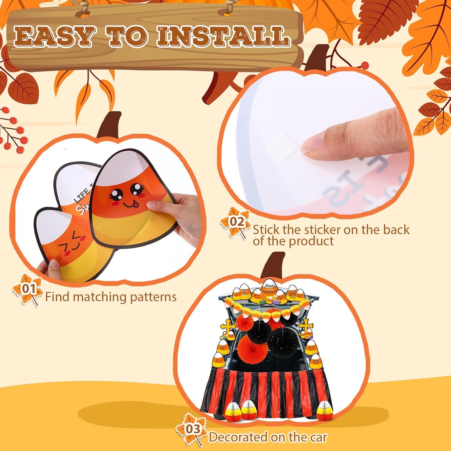 Halloween Decoration Set: with this kit, you will receive 9 religious themed candy corn Halloween car trunk borders, 1 orange and black table skirt, 6 tissue paper hanging fans, 1 candy corn banner, and 3 candy corn honeycomb decorations; This comprehensive Halloween treat car decorations set allows you to fully decorate your vehicle or garage door, in keeping with the Halloween spirit; The size of the candy corn is varied depending on its shape as presented in the image descriptions