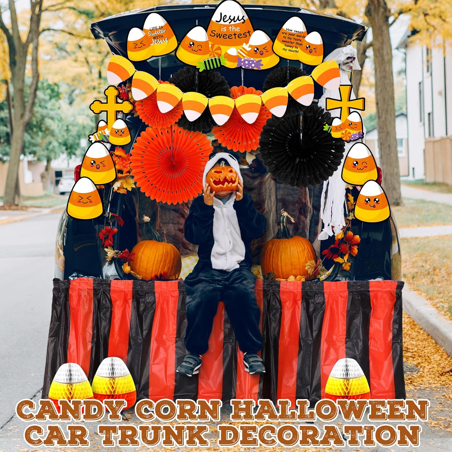 Trick car decorating kit features religious themed candy corn decorations, orange and black table skirts, paper fans, banner and honeycomb decorations, which could embellish your garage door, patio or house front.