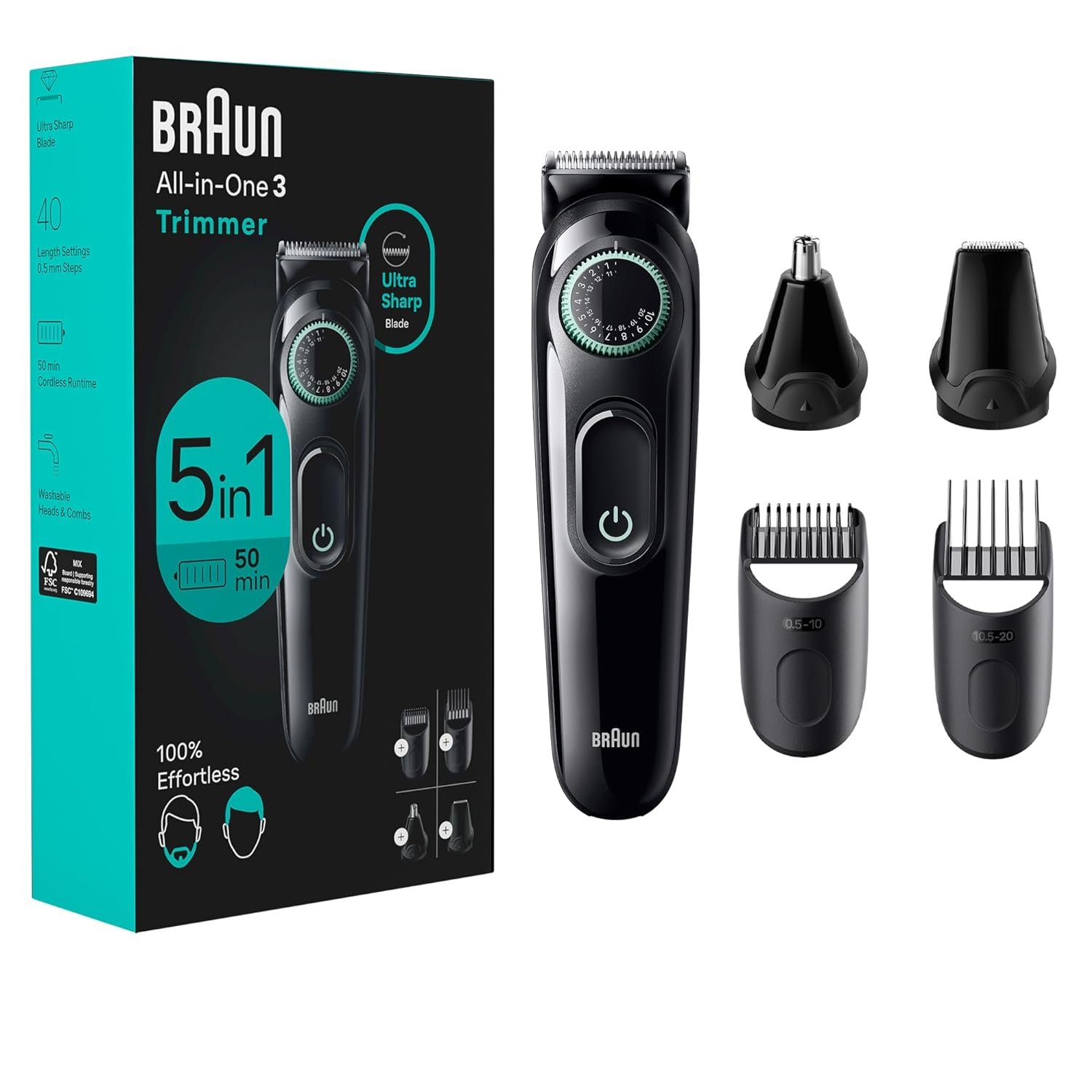 Price: (as of - Details) Braun Series 3 All-In-One Style Kit. For versatility and precision at home. With a beard, ear & nose trimmer and hair clippers. Features the Precision Wheel with 40 length settings and ultra sharp blades. 50-minute cordless runtime. Includes: Plastic trimmer head, precision beard (0.5 mm