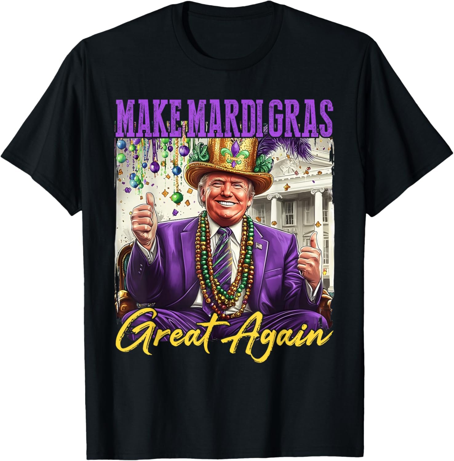 Price: (as of - Details) This unisex, all-season T-Shirt is a humorous must-have for Trump supporters and Mardi Gras enthusiasts. Crafted with a lightweight, straight fit, it features a black, short-sleeved design with a round neck and flat collar. The letter print showcases a playful Mardi Gras-themed image of Donald