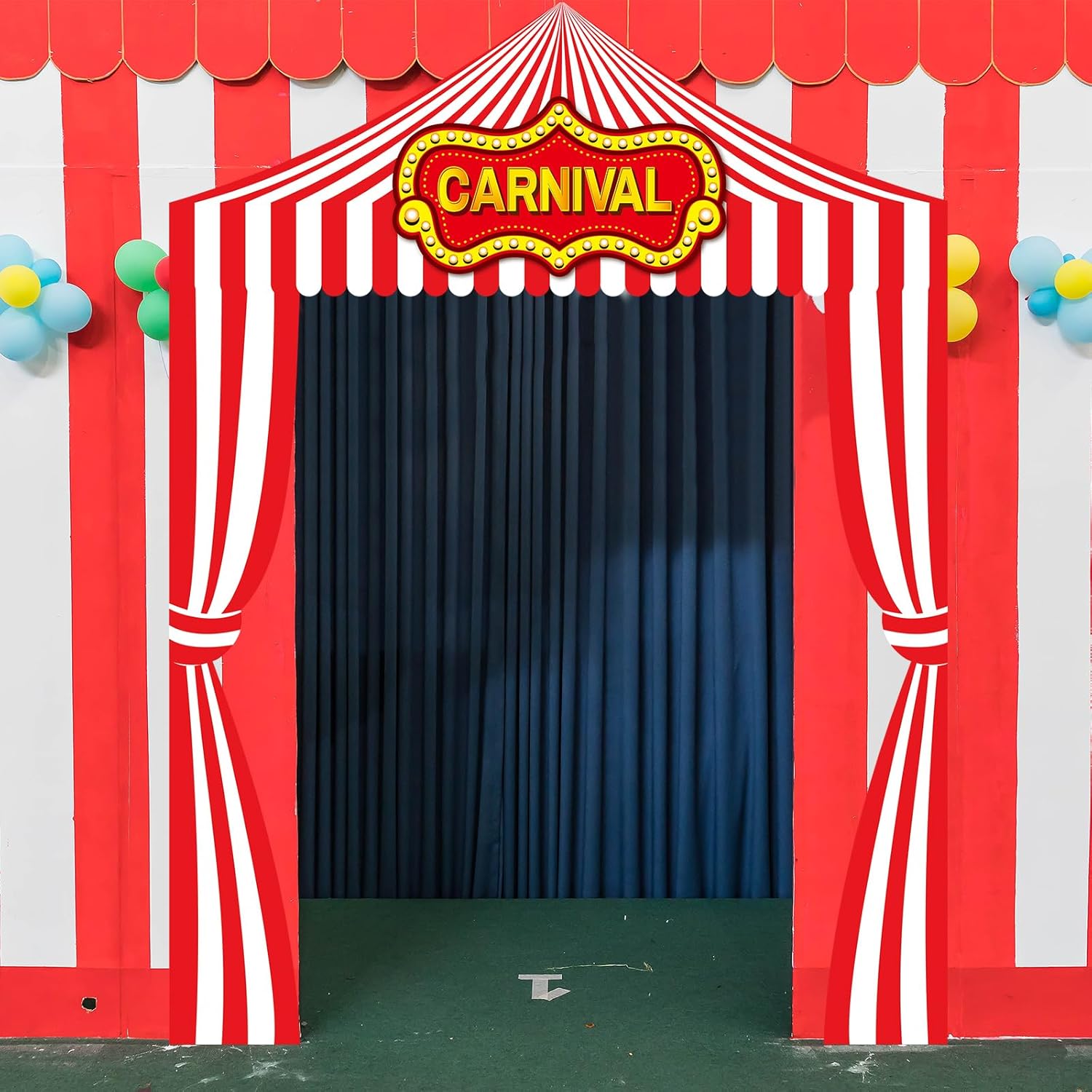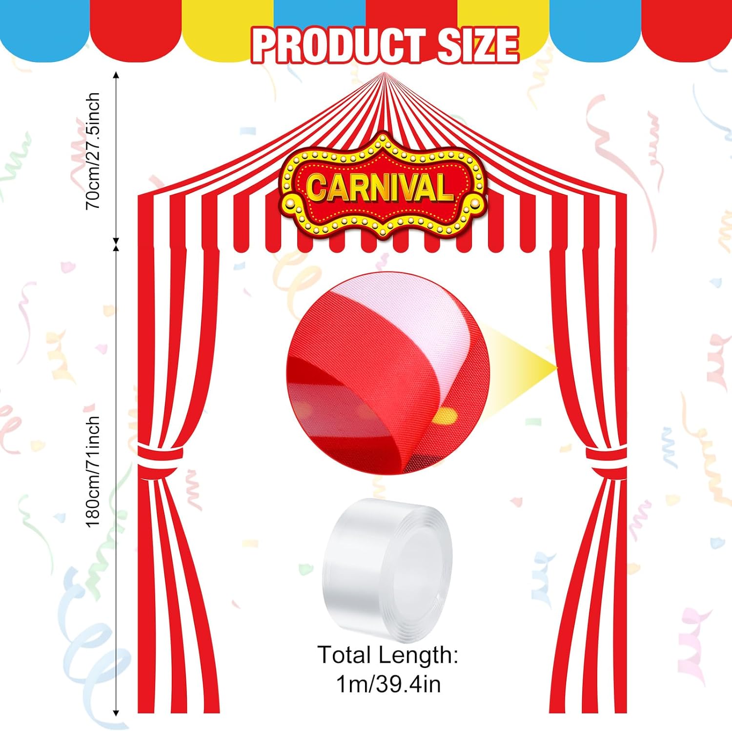 Complete Carnival Awning Set: included is 1 circus canopy, 2 red and white striped carnival banners, and 1 roll of double sided tape for easy installation; These carnival party decorations are not only for parties, they are a good way to enhance the appearance of your store, restaurant, or other public space; Put a touch of color and excitement into each gathering and let everyone enjoy a good time with family and friends
