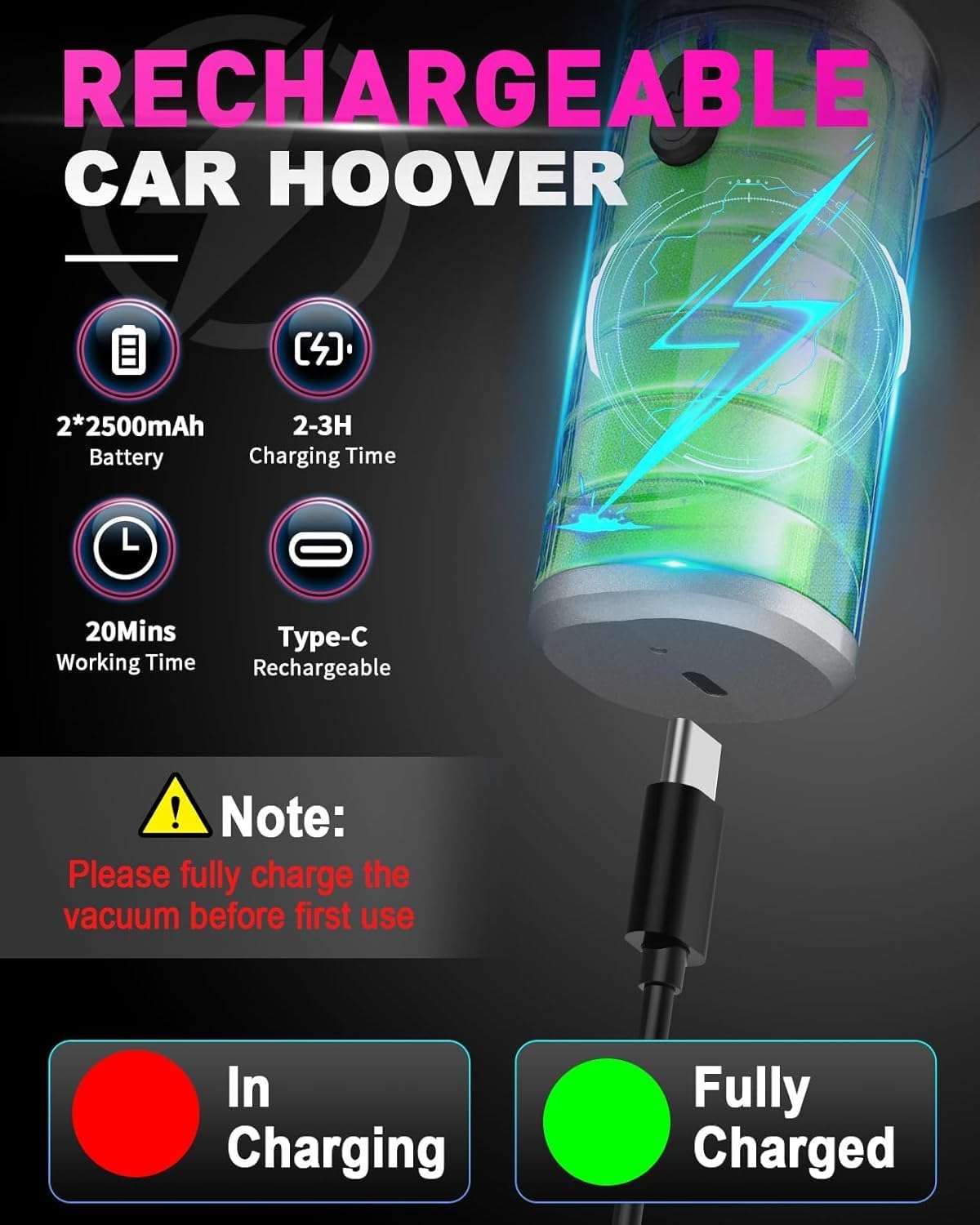 ๐„๐ฑ๐ญ๐ž๐ง๐๐ž๐ ๐๐š๐ญ๐ญ๐ž๐ซ๐ฒ ๐‹๐ข๐Ÿ๐ž — This handheld car vacuum equipped with a 5000mAh rechargeable battery, offering up to 30 minutes of continuous cleaning. You can thoroughly clean your car without worrying about losing power. Comes with a charging cable, making cleaning quick and hassle-free