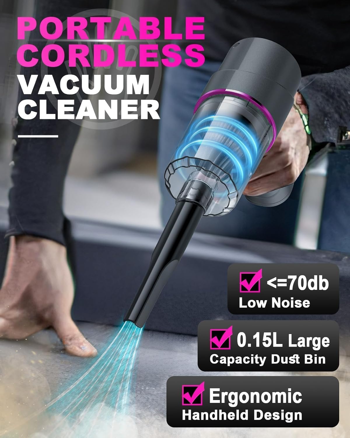 4-๐ข๐ง-1 ๐Œ๐ฎ๐ฅ๐ญ๐ข๐Ÿ๐ฎ๐ง๐œ๐ญ๐ข๐จ๐ง๐š๐ฅ ๐‚๐ฅ๐ž๐š๐ง๐ž๐ซ — The handheld car vacuum cleaner offers 4-in-1 functionality. Car vacuum portable cordless not only cleans but also has a blowing feature. This makes car vacuum easy to clear dust, leaves, and debris from hard-to-reach spots like air vents, cup holders, and under seats. Mini vacuum cleanerโ€™s a versatile tool to keep your car clean and tidy