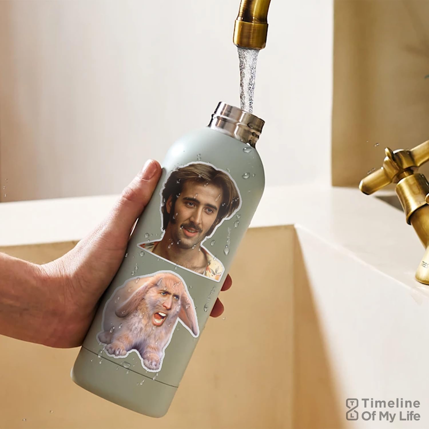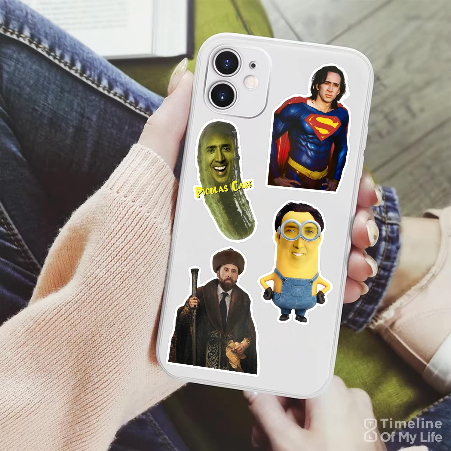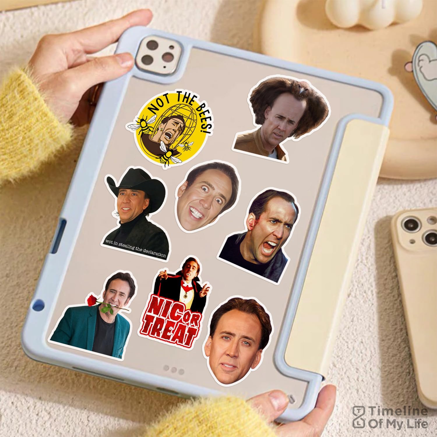 Nicholas Cage stickers printed on high-quality PVC material. This funny Nicholas Cage sticker pack is waterproof and weatherproof, glossy and bright, thick and durable for long time.