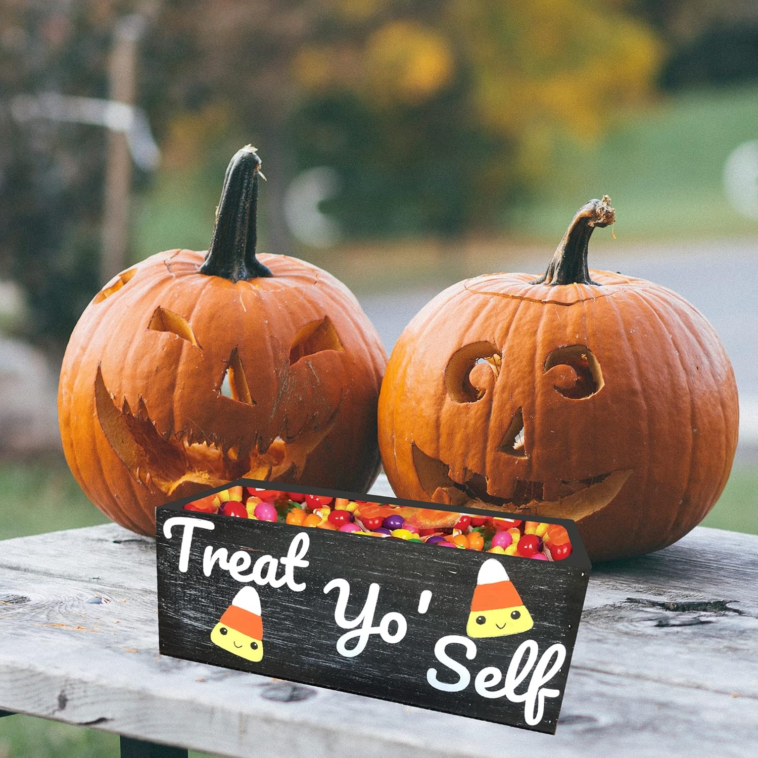 Use as a candy dish for your colleagues, friends or trick or treaters at Halloween — or use it as a fall planter and fill it with your favorite succulents or flowers (faux or real!). These adorable bins are hand painted with sweet pieces of candy corn who wants you to “Treat Yo’ Self!” Dimensions: 10x4x5 inches Material: Rustic black-washed wood Hand painted with acrylic paint and sealed with varnish. Vinyl lettering is applied by hand. ***PLEASE NOTE: This listing is for a wood bin only and does not include plants (or candy!). There is a removable plastic liner in the wooden box.***