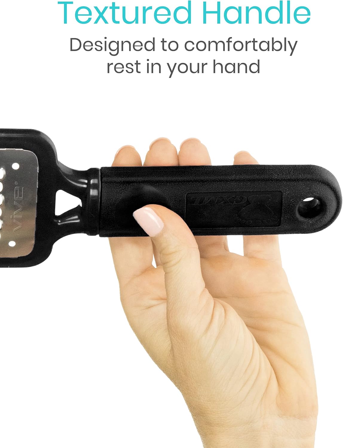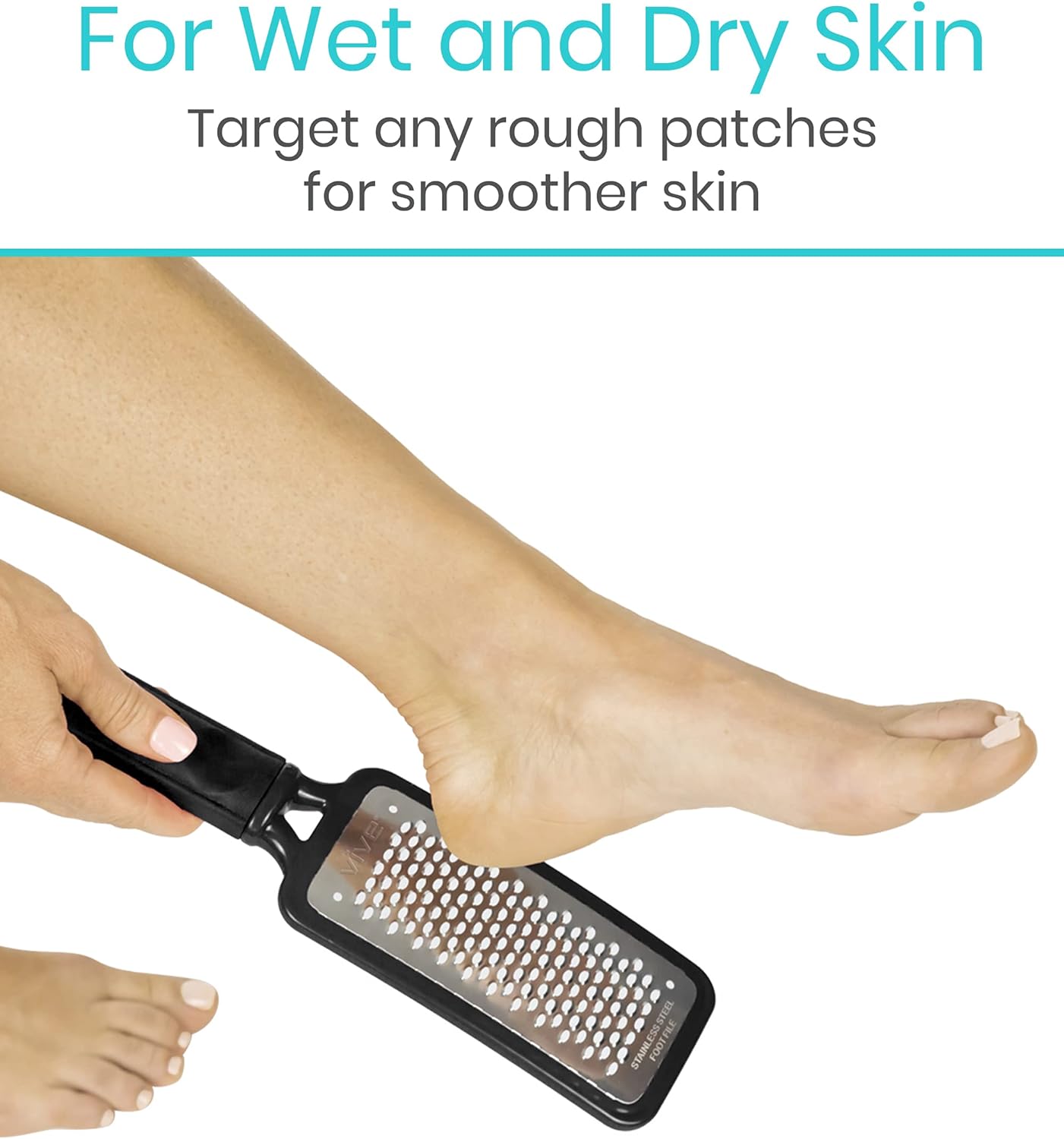 VERSATILE PEDICURE FILE: Smooth and soften rough, dry skin with the sharp, stainless steel foot file by Vive. The versatile pedicure rasp is safe for wet or dry use, effectively removing dry, dead skin. Ergonomically designed, the file is also gently curved for use at any angle, easily smoothing hard to reach areas.