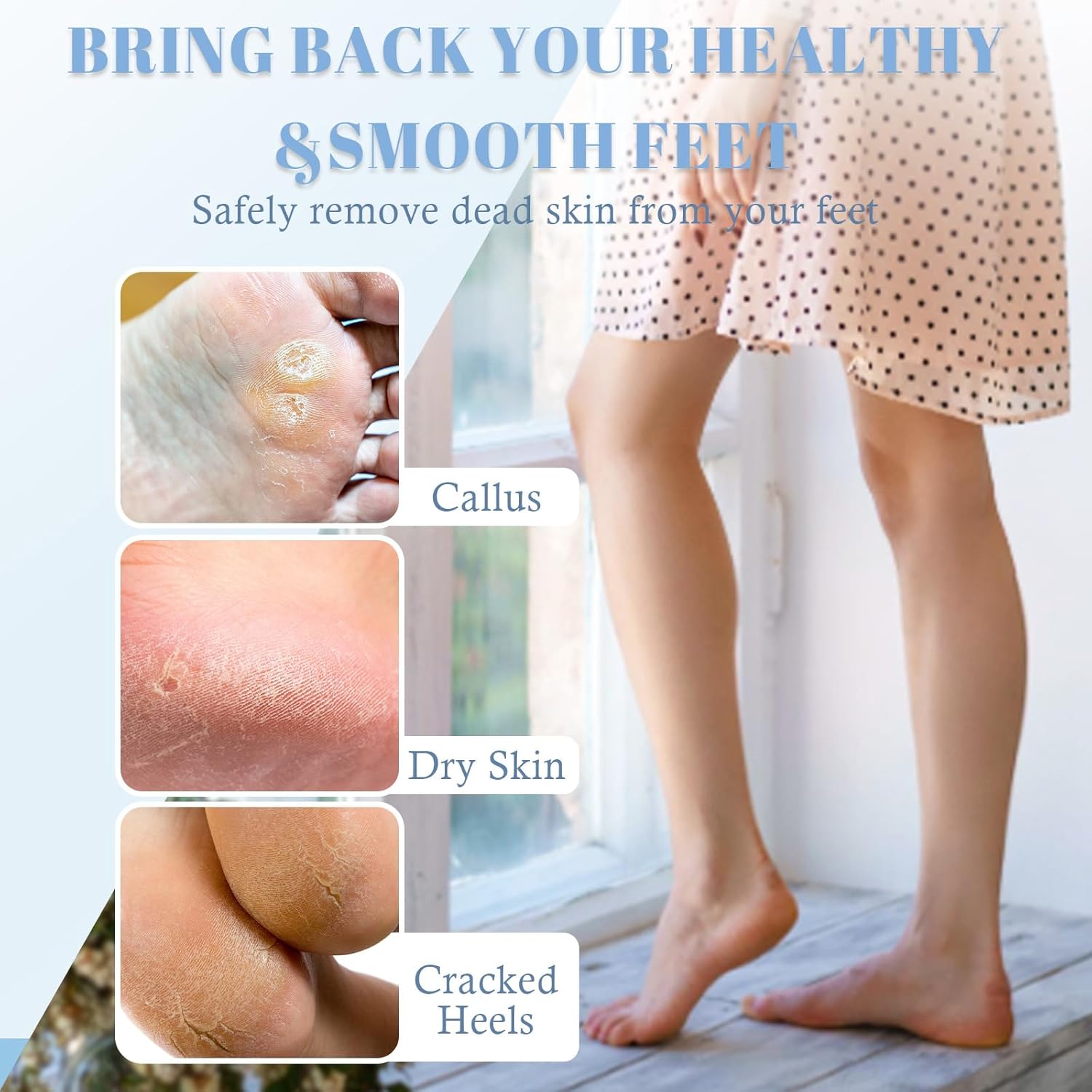 Dead skin scrubber works well for hard, rough and dry skin along with calluses on the feet as well as hands, knees and elbows.
