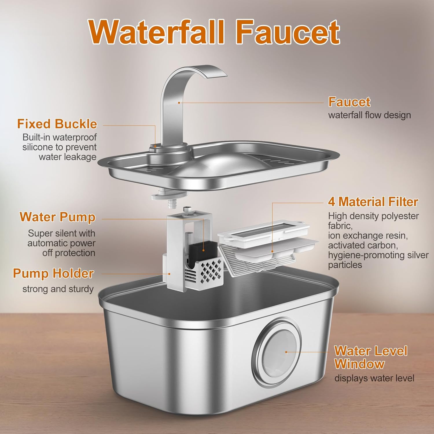 (Ultra-Quiet Pump & Reliable Auto Shut-Off Feature) The stainless steel cat fountain is expertly designed to enhance your pet’s comfort, featuring a stylish waterfall-style fountain and curved surface bumps that minimize the noise created when water strikes a flat surface. The pump functions at an ultra-quiet level of ≤23dB, ensuring that your furry friend can enjoy the pet water dispenser without being startled or disturbed by noise, thus maintaining their comfort during daily routines.