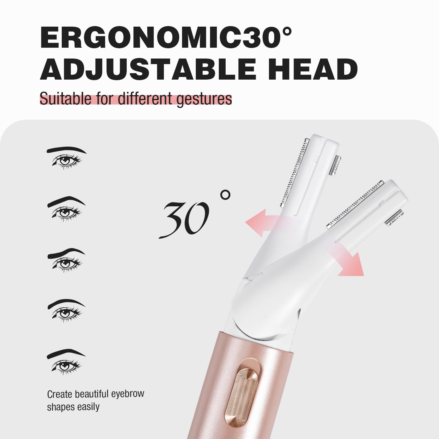 【Double Cutter Heads for Fine Trimming】This eyebrow trimmer adopts an innovative double-blade design, and the blade supports a 30° adjustable angle, allowing you to easily trim facial details. Whether it’s fine hair on flat skin or acne-prone areas, it can be easily removed, making it ideal for trimming unwanted hair on eyebrows, cheeks, peach fuzz, lip hair, chin, sideburns, neck, ears and other areas.