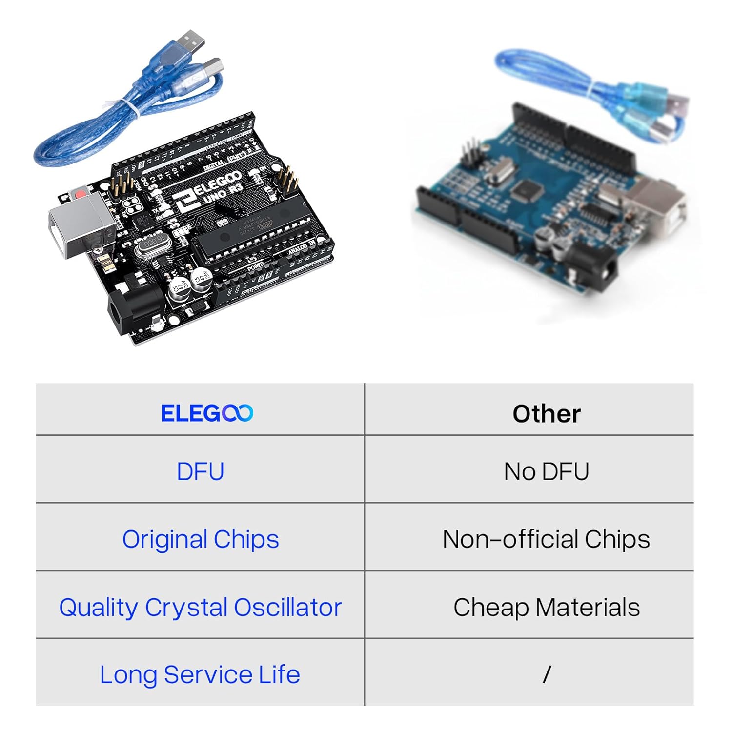 The ELEGOO UNO R3 BOARD now uses an 16U2 instead of the ATMega8U2 chip. Faster transfer rates and more memory.