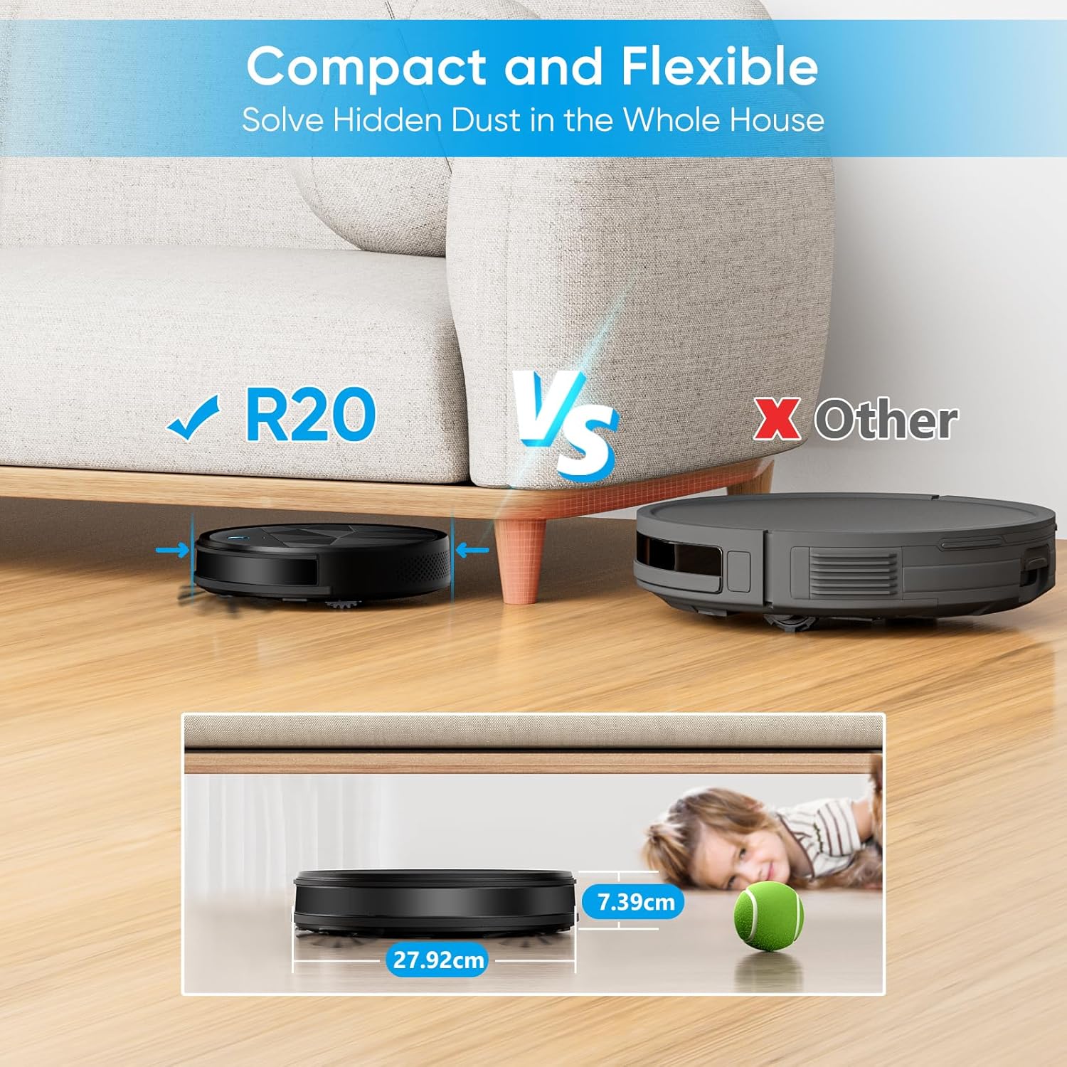 The R20 Robotic Vacuum Cleaner has a diameter of 11 inches and a height of 2.89 inches and is designed in a slim and light body ,with wide coverage and high cleaning efficiency.