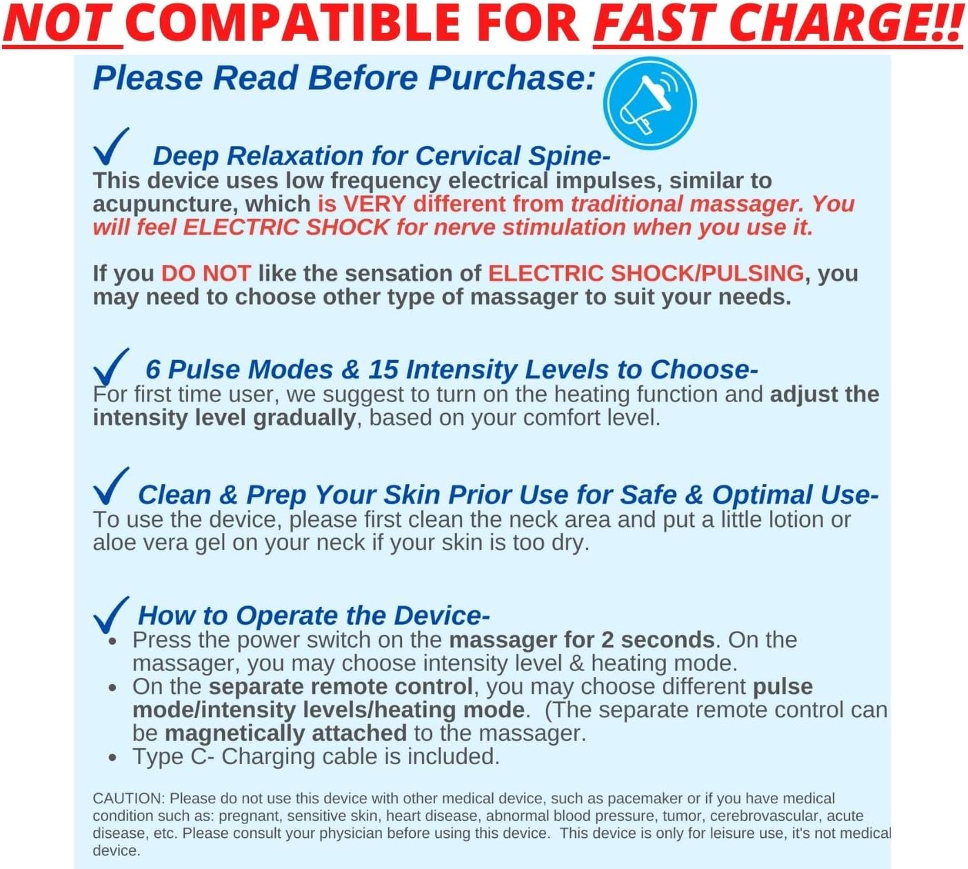 IT’S NORMAL TO FEEL ELECTRIC SHOCK/STIMULATION TINGLING DURING THERAPY – Start from the lowest intensity and gradually add intensity. If you neck is dry, please put some lotion or wet your neck a little BEFORE therapy for ultimate experience. We are US seller and strive to provide the best customer experience, for questions or concerns about product, please contact us via Amazon.