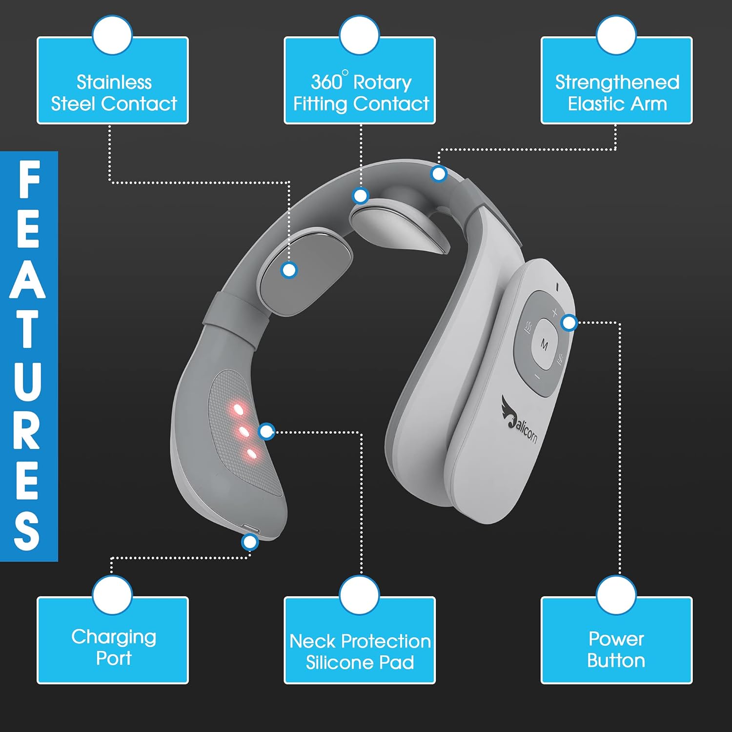 3D Electrodes fitting, which can easily adjust the electrodes according to your neck curve, making it more comfortable to use.In additional to the electrodes, the 2 sided neck compression are also heated, bring you warm & soothes all-around your neck.Breathable skin-friendly silicone and it can directly contact the skin, comfortable and breathable without allergies.A separate wireless remote control that can be magnetically attached to the device. Easy to carry and storage.Equipped with high-quality Type-C charging port rechargeable.
