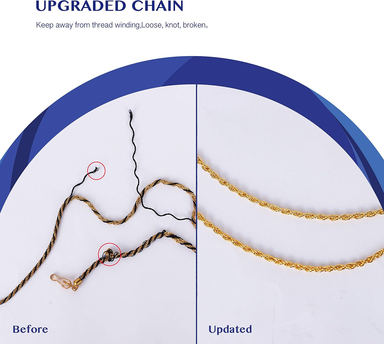Theater glass come with a updated delicate gold chain,compared to the old chain with black lines, it can’t loose ,twine,knot and breakage.