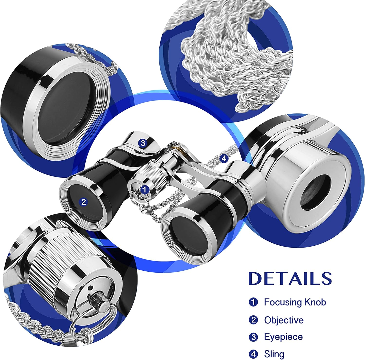 Multi-coated 25mm optical glass objective lens and 3X opera binoculars offer light transmission.