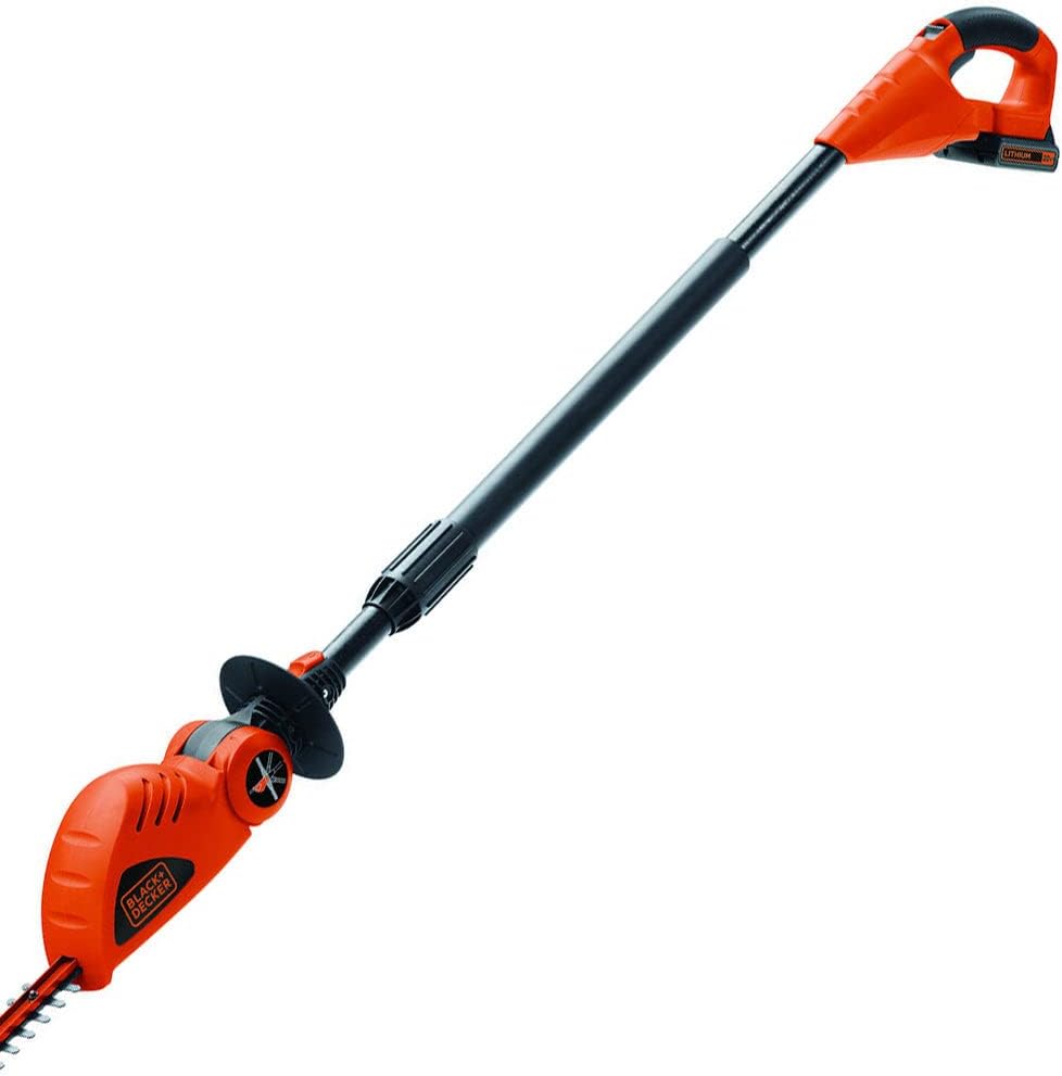 The BLACK+DECKER 20V MAX* 18 in. cordless pole hedge trimmer is the ideal choice for trimming tall hedges and shrubs, as well as pruning over and around obstacles. At only 7.7 lbs., it’s lightweight and provides the stability and control you need to make precision cuts. The 180°, 5-position pivoting head allows you to trim the top and bottom of a hedge, or even behind it with precise, level results.Because trimming hard-to-reach spots can be strenuous work, this easy-to-operate cordless pole hedge trimmer is designed with your comfort in mind. Its 18 in. dual-action blade cuts quickly and easily through branches up to 7/16 in. thick and with 40% less vibration than conventional pole hedge trimmers, reducing operator fatigue.Reliable reachThis cordless pole hedge trimmer offers an innovative rust-proof fiberglass shaft, with sections that securely interlock to provide a strong connection. Altogether, the trimmer gives you a usable length of 6-1/2 ft. and up to an 11 ft. trimming height for tall or awkward jobs all around your yard.Lasting powerThe LPHT120 cordless pole hedge trimmer is powered by a BLACK+DECKER 20V MAX* lithium ion battery for excellent cutting performance and long-lasting use for seasons to come. The battery offers a longer lifespan and retains its charge 5x longer than similar 18V NiCad batteries. It’s compatible with the full line of BLACK+DECKER’s 20V MAX* line of power and gardening tools. Plus, your mobility won’t be limited by an extension cord.What’s in the box (1) LPHT120 hedge trimmer, (1) LBXR20 20V MAX* lithium ion battery, and (1) LCS20 smart charger.*Maximum initial battery voltage (measured without a workload) is 20 volts. Nominal voltage is 18 volts. Cutting Strokes/Min 2500.