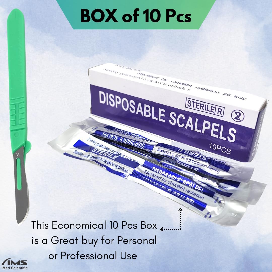 Individually Foil Wrapped in Vacuum Sealed PouchesPremium Medical Grade Carbon Steel BladesSterilized by Gamma RadiationSturdy Plastic Handle with Engrained Metric Line MeasurementsComes with a Protective Blade Cap