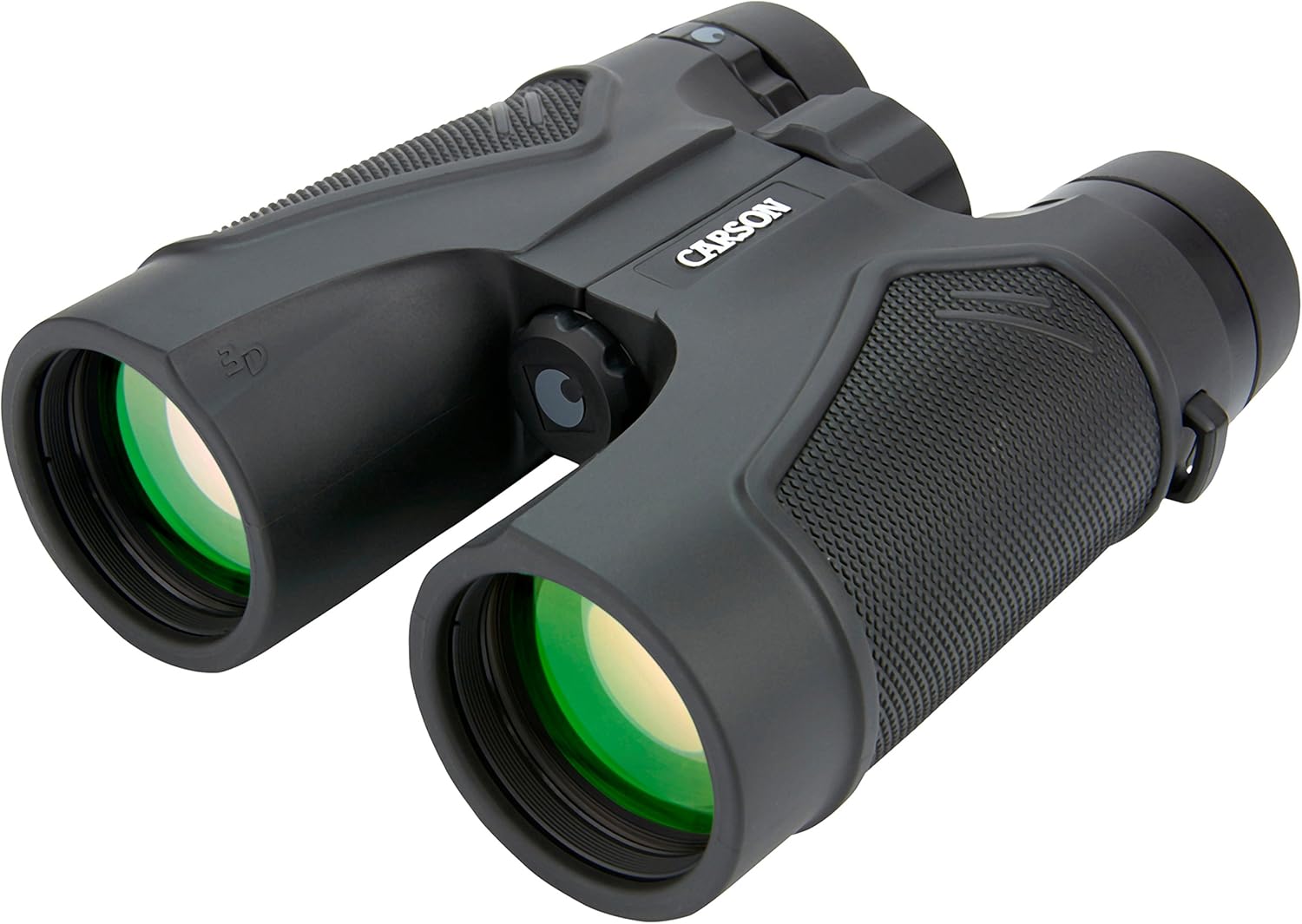 “The full sized 3D Binoculars combine Carson’s HD optical coating technology with ED glass to give you the brightest and clearest image possible. The 3D Series Binoculars with ED Glass is ideal for use as hunting Binoculars or birding binoculars. Rubberized armor coating makes this Full-Sized 3D Binocular rugged and shock proof. The body is nitrogen purged and O-ring sealed making them waterproof and fog proof. The precisely placed thumb grooves, rubberized armor texturing and all-over lightweight body ergonomics make the 3D Series Binoculars perfect for long hunts or bird watching expeditions. The 3D Series is also perfect outdoor activities or sporting events. Extra long eye relief with twist down eyecups make this Full-Sized 3D ED Glass Binocular perfect for eyeglass wearers. These binoculars come included with the following accessories: 3D Series HD Waterproof Binoculars with ED Glass, carrying case, neck strap, shoulder harness and a lens cloth. The case for this device contains magnets which can interfere with pacemakers and implantable cardioverter defibrillators (ICD’s). Individuals with pacemakers or ICD’s should NOT use this product.”