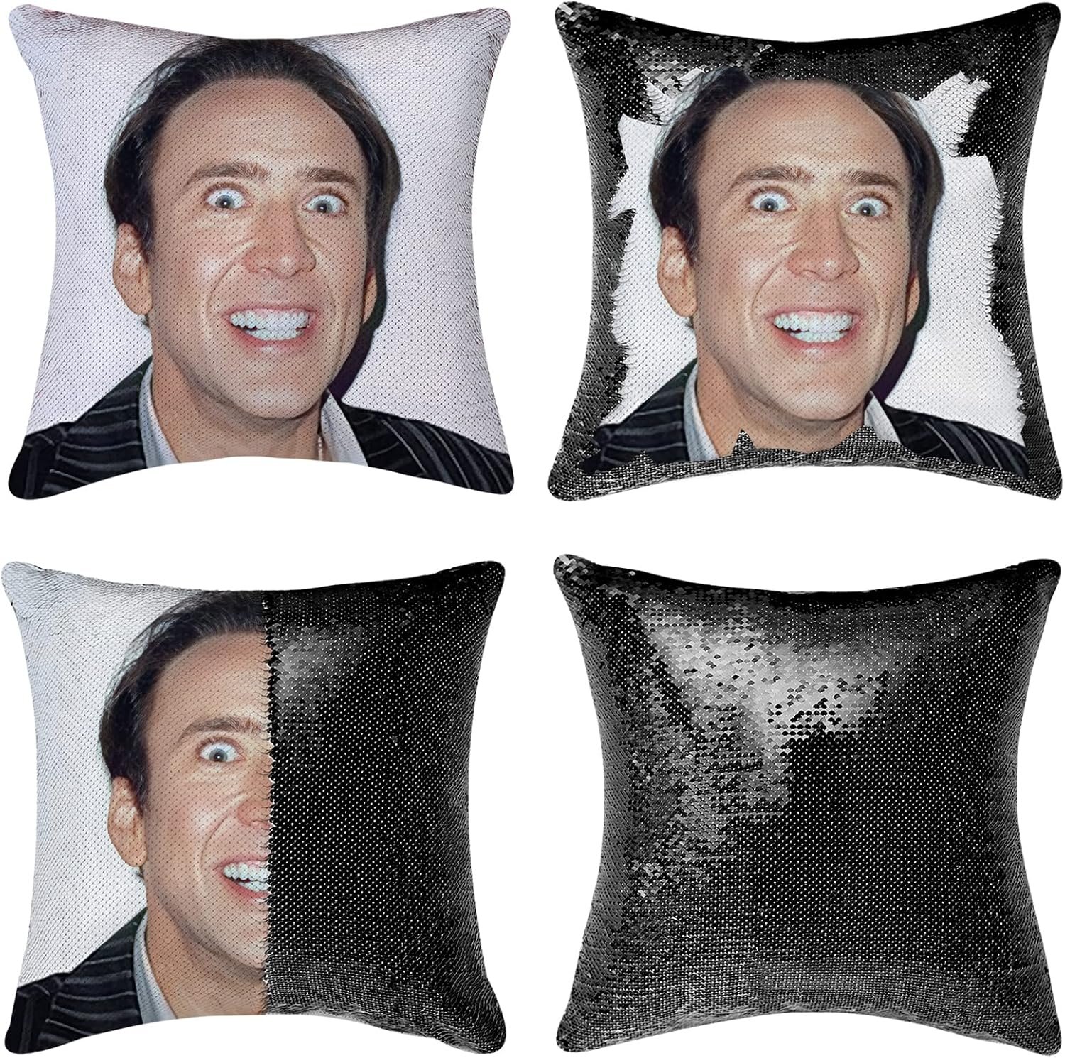 Price: (as of - Details) LydeLog Nicolas Cage Pillow Covers Sequin Pillow Cases Funny Gag Gifts Reversible Sequin Pillow Cover Decorative Throw Cushion Case 16 x 16 Inches 50% Sequin 50% CottonPACKAGE &SIZE & MATERIAL--PILLOW COVER ONLY,pillow inserts are NOT included! Size: Approx.16"*16" (40CM x 40CM) . Material: reversible sequins (front) and