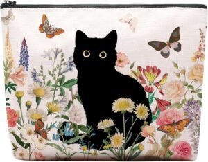 Black Cat Makeup Bag, Cat Vintage Flowers Cute Cosmetic Bag, Cat Gifts for Women Cat Lovers, Cat Mom Stuff Gift Bag for Women Friend