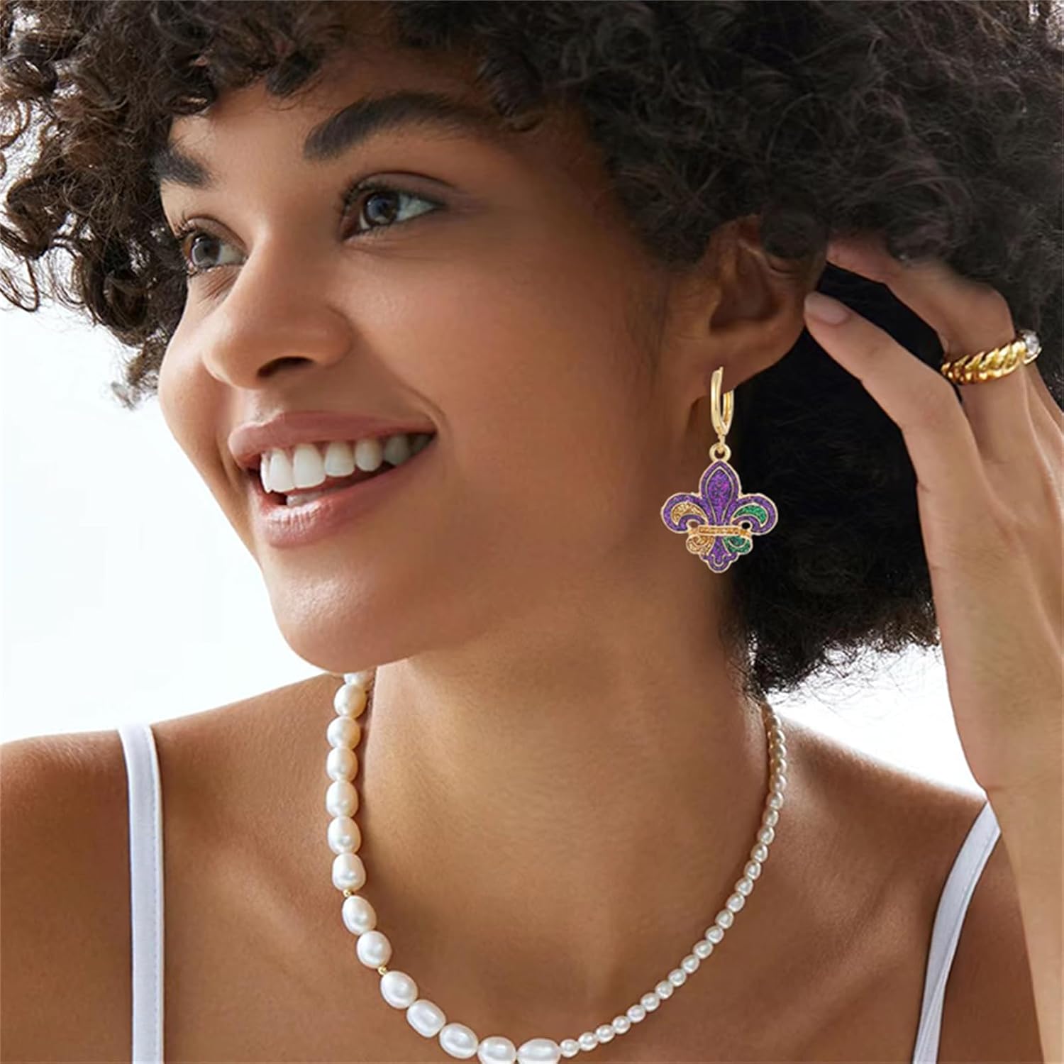 Embrace the vibrant spirit of Mardi Gras with these dainty and festive hoop earrings! Crafted with intricate details, these earrings feature iconic symbols of the carnival celebration, including the fleur-de-lis, feathers, masks, crowns, and jester hats. Dangling gracefully from the hoops, these charms add a touch of whimsy and fun to any outfit. Perfect for Fat Tuesday or any occasion, these earrings are a must-have accessory for those who love to embrace the festive spirit. Lightweight and comfortable to wear, these earrings are sure to become a cherished addition to your jewelry collection. Celebrate in style with these Mardi Gras-inspired hoop earrings!