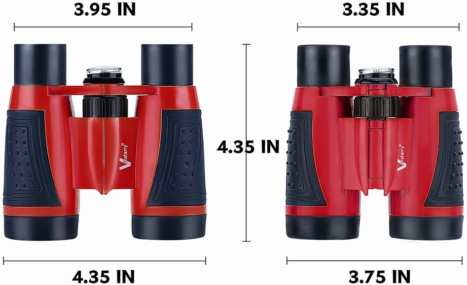 This binoculars has 5 x magnification, 30mm objective lens and wide field of view,ensures the user can see the entire visual field for capturing objects easily with 7.2° viewing angle(International military standard binoculars multiples are between 4-8 magnification).The lightweight cruise binoculars is cover with BAK4 prism texture. The objective lens use optical FMC multilayer broadband green film, light transmittance reaches 99.5% ,and the eyepiece-optical is made of ruby FMC coating. The imaging effect is much higher than other broadband green films, single-layer blue films and other common products.Made of soft silicone material, it will not harm the human body .And the soft rubber surrounded eyepieces included for eye protection so children won’t get hurt.There is extra coating surrounding the eyepieces compared to other brands and provides better protection of the lens during falls.Durable binoculars that can withstand drops and falls on floors due to rubber coating that absorbs shock. If accidentally dropped on the ground, the binoculars are protected from damage with shock proof rubber armor compared to other brands and provides better protection of the lens during falls,life waterproof design,to avoid rain and mold.The grip has been ergonomically patented designed the rubberized hand grips perfect for little hands, A large centrally located focus wheel that is easy to focus and can be adjusted to easily match the eye distance gap give little adventurers a closer view of nature!