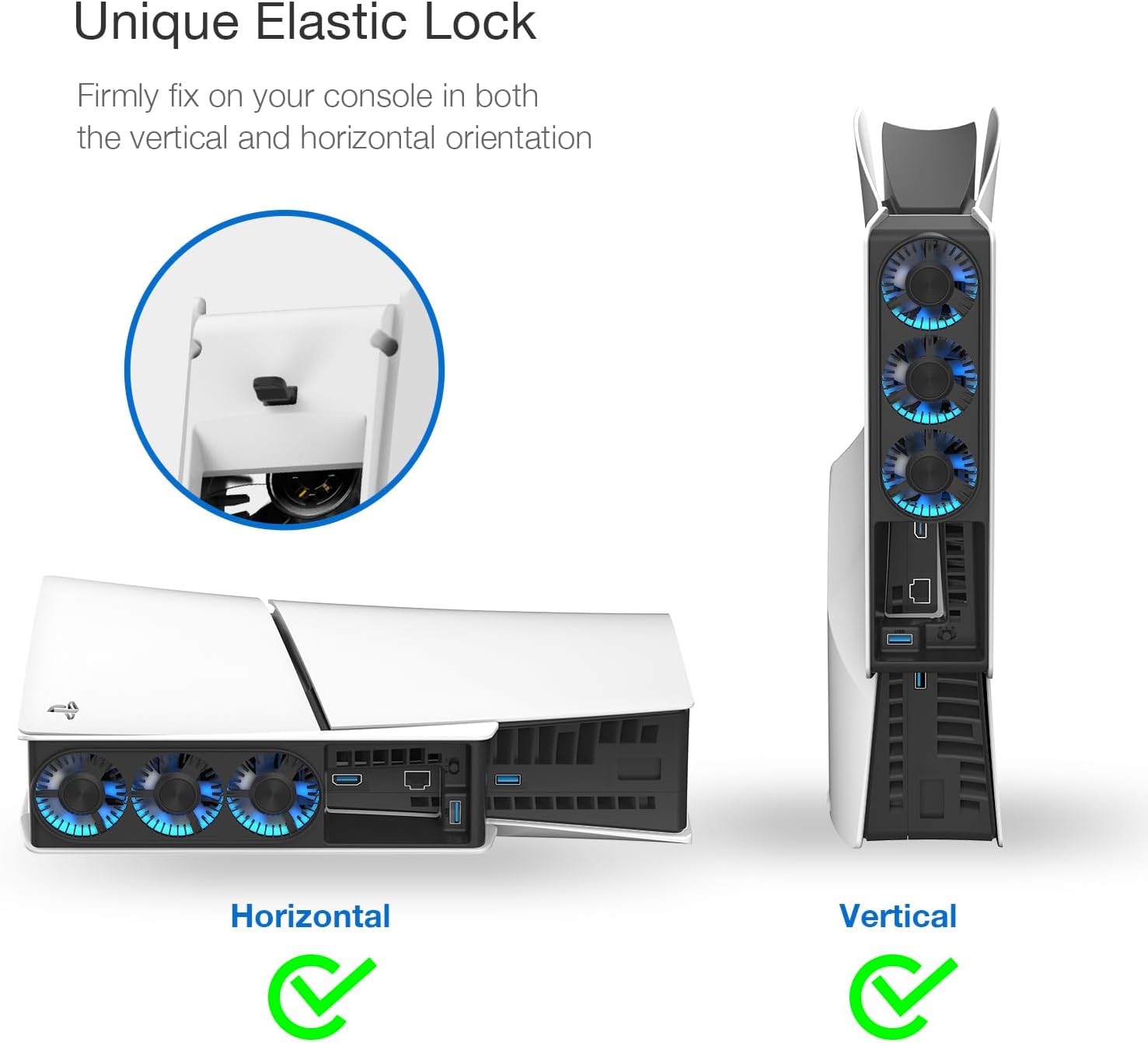 【Perfect Compatibility】Special designed for PS5 Slim digital/disc editions console. This PS5 Slim accessories cooler consists of 3 fans to evenly disperse heat and quickly dissipate heat from the whole PS5 system, prevents overheating issues, malfunction lags, this helps keep your PS5 Slim Console / PS5 Slim Digital Edition cool & run smoothly, and greatly improves consoles lifespan. Note: NOT for Original PS5 2020 or PS5 Pro 2024 versio