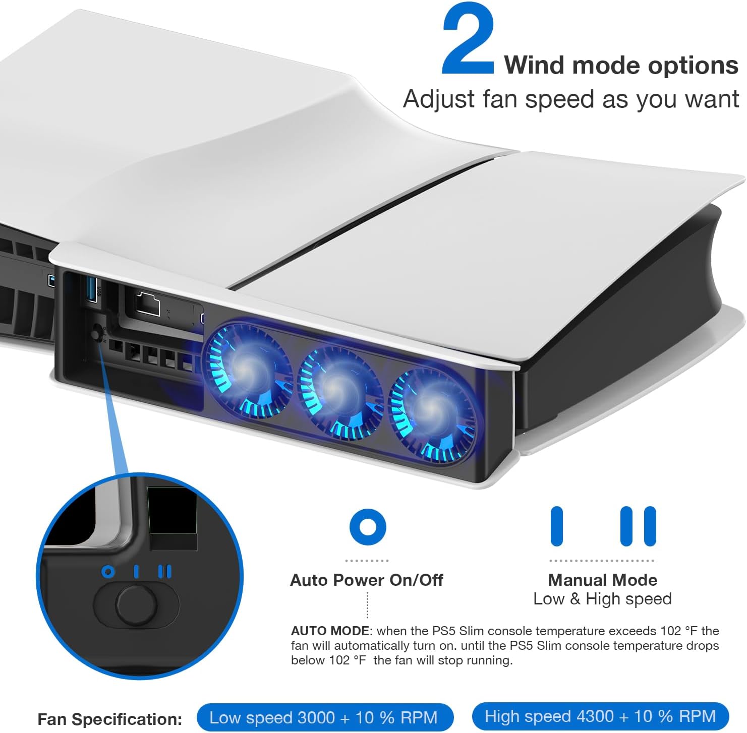 【Humanized Design】The PS5 Slim cooling fan display a splendid blue light when working, a perfect gift for ps5 gamer.Mute turbofan, keep quiet even in max efficient running modes.Equipped with two speeds,Now you can adjust the wind speed according to the game size and game time and enter the game world.