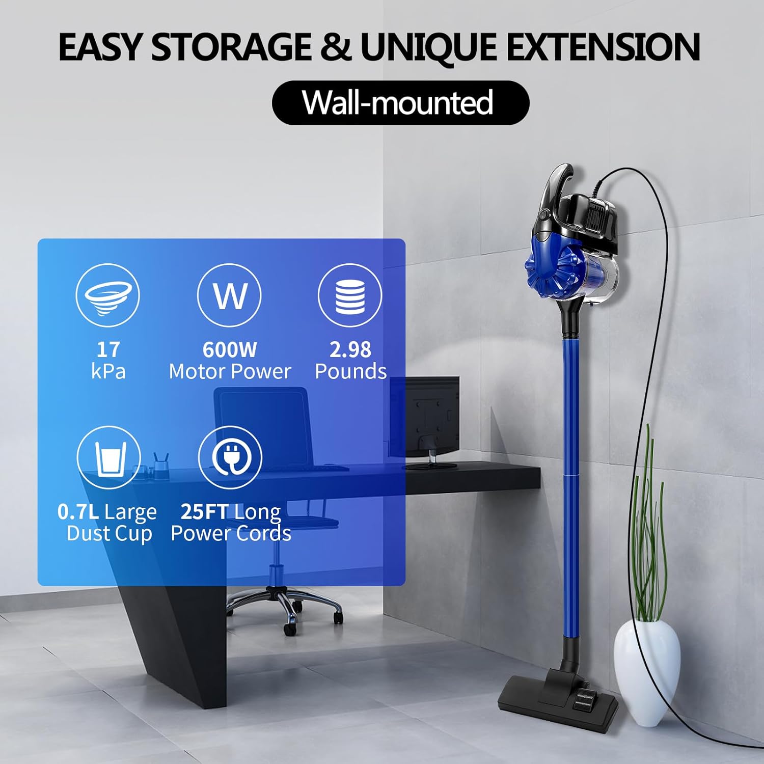 ▶【Proweful Suction】: This stick vacuum cleaner is equipped with a 600W strong motor, can generate up to 17000Pa powerful suction, perfect for hardwood floors, marble floors, tile, low pile carpet and can easily pick up all kinds of particles like dust, pet hair, pet litter, food scraps, etc.