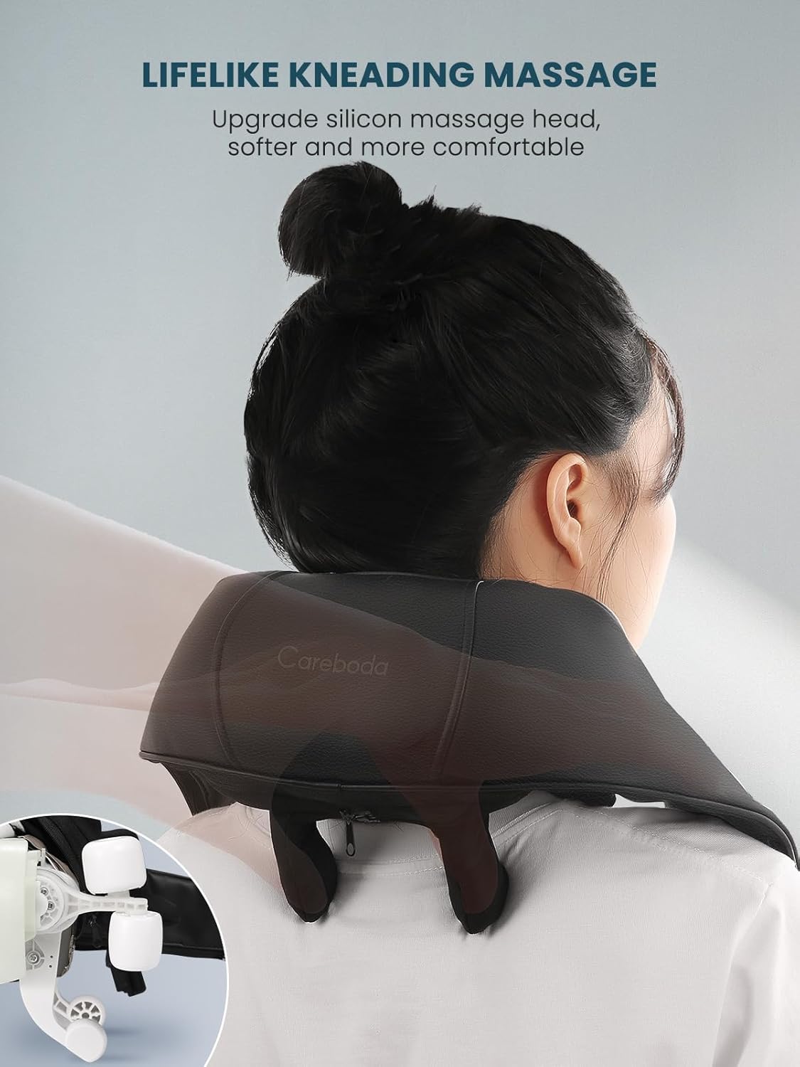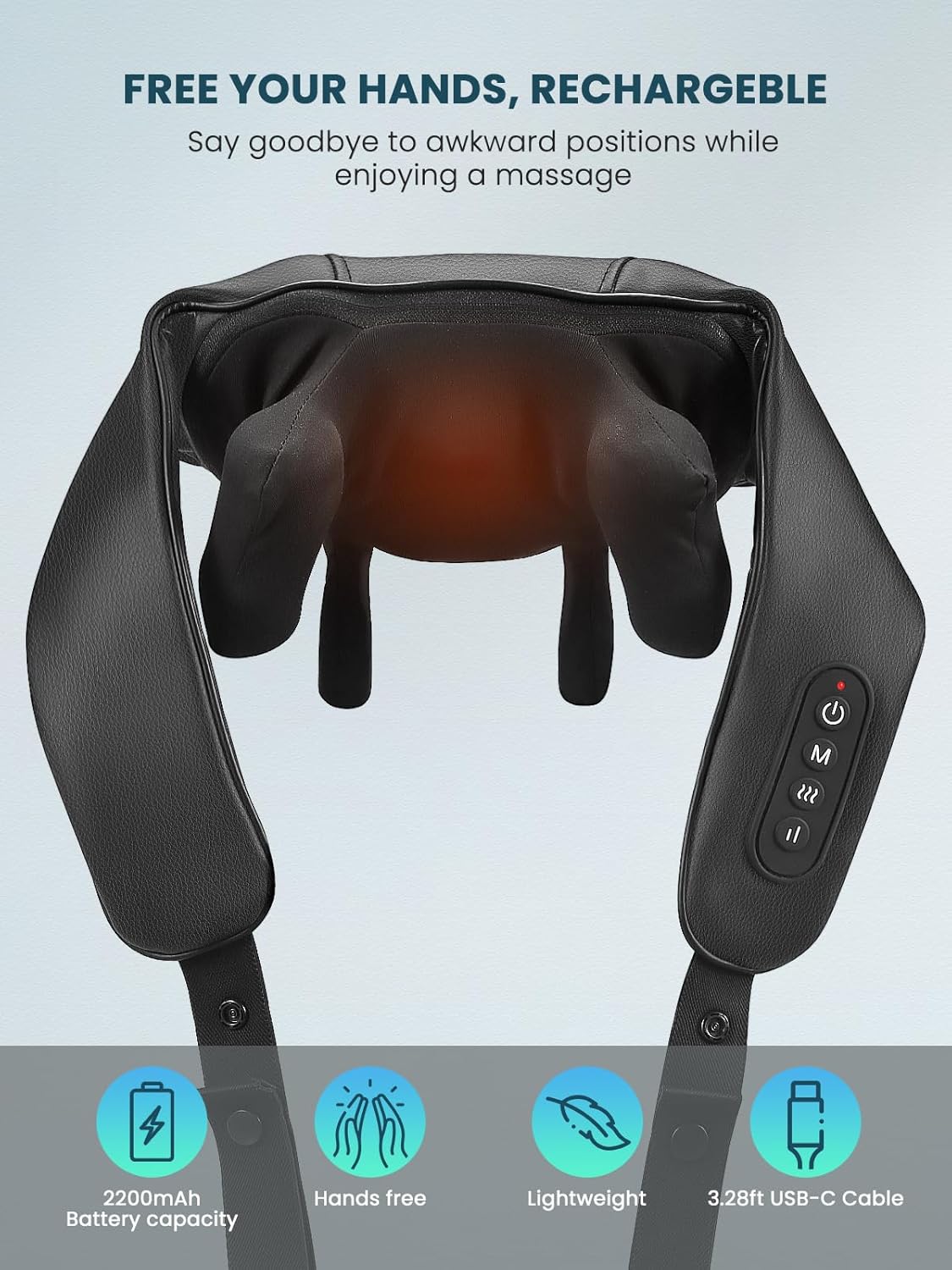 WIRELESS AND RECHARGEABLE: No more tangled cords or limited mobility. Our neck massager is cordless, allowing you to enjoy a soothing massage anywhere, anytime. The Careboda massager has a built-in rechargeable 2000mAh lithium battery and comes with a 3.3ft long USB C charging cable, providing up to 90-100 minutes of relaxation on a single full charge