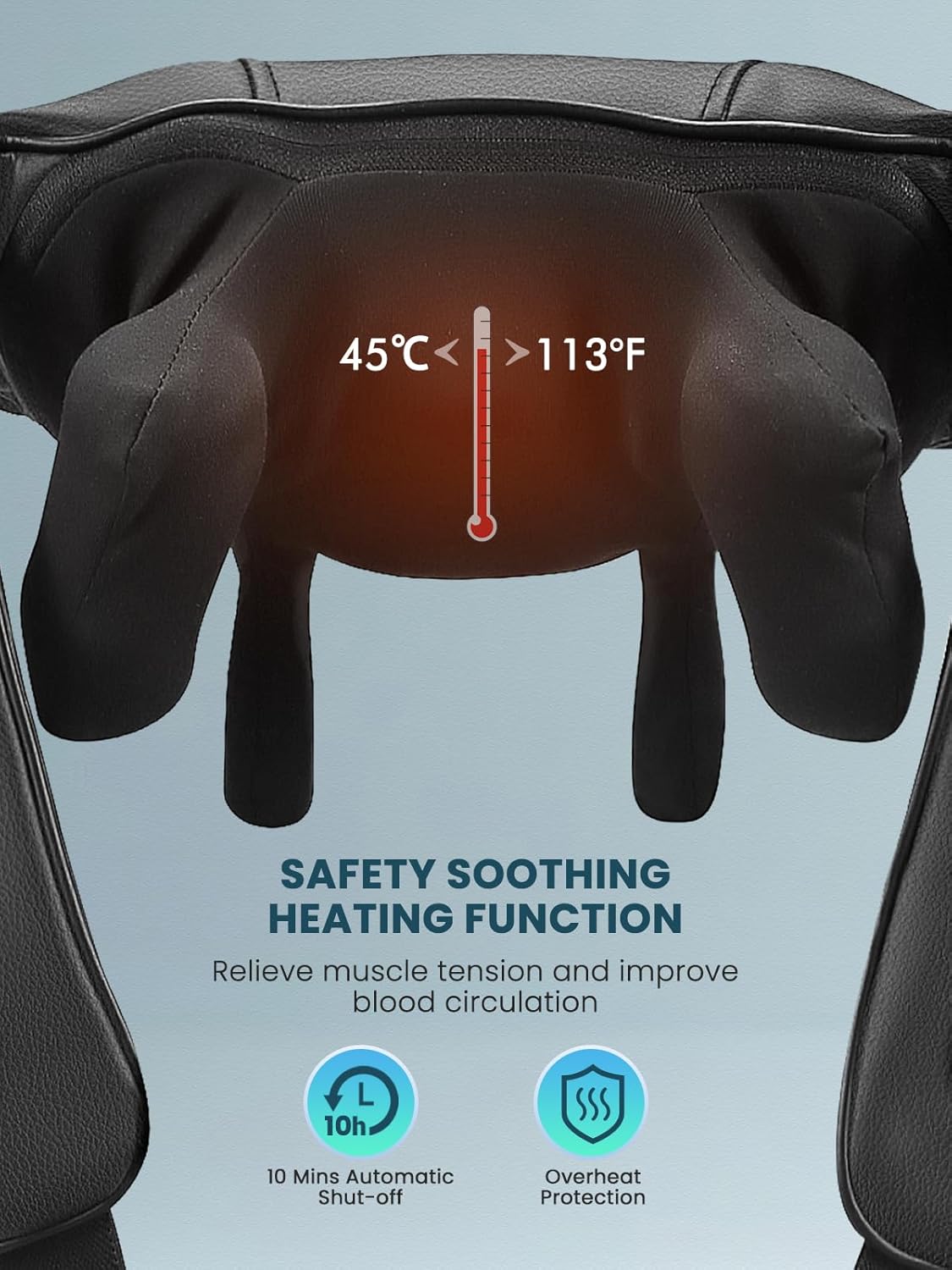 SOOTHING HEAT THERAPY: Enhance your massage experience with the built-in heating function, which provides gentle warmth to soothe sore muscles, promote relaxation, and offer additional relief. The massage device is also equipped with a 10-minute automatic shut-off design for your safety