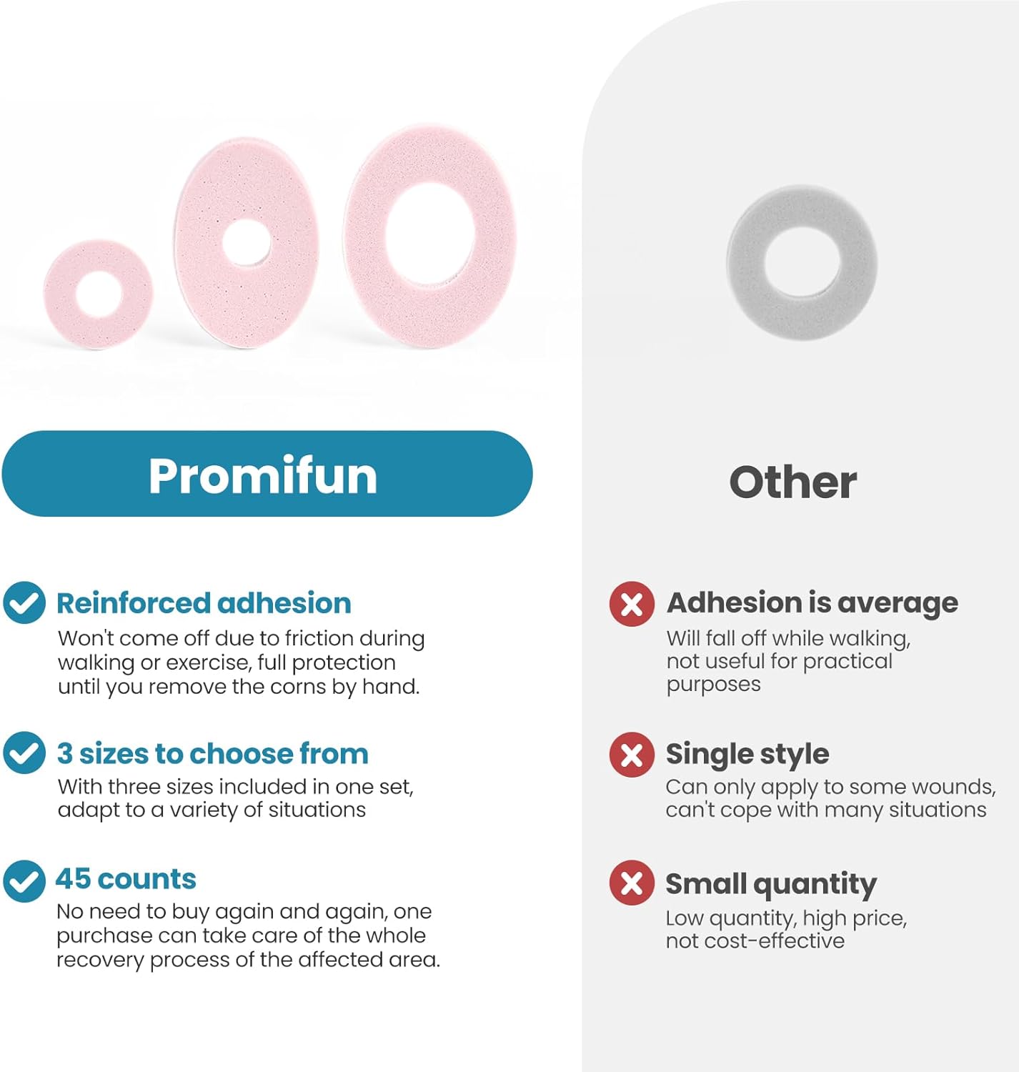 【Real Pain Relief】Promifun corn cushions provide cushion and comfort to reduce pressure from painful, irritating corns, calluses, blisters, and other hot spots. Providing support where you need it most and helping you say goodbye to discomfort.