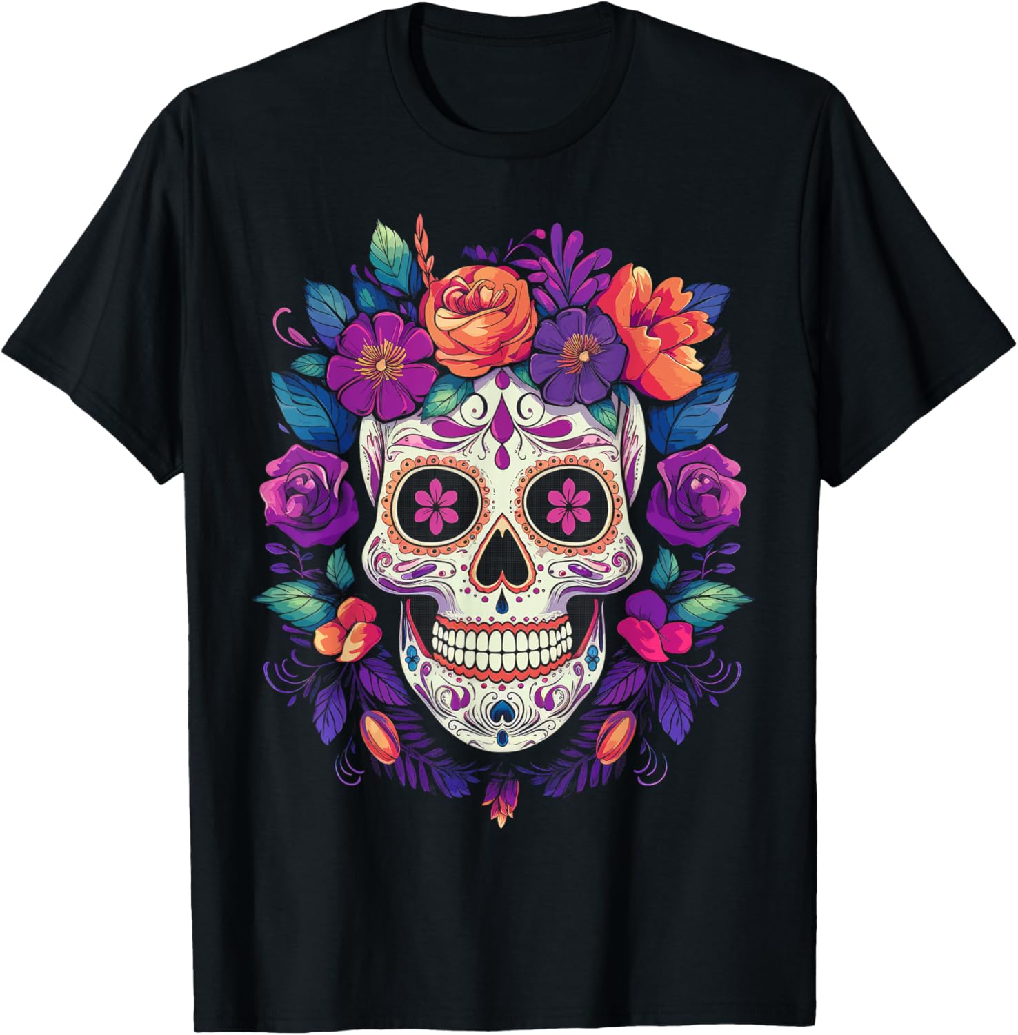 Sure to be a hit on Halloween or day of the dead celebrate in style with this cute floral sugar skull top for women. Makes a great Dia De Muertos party top. Share your love of day of the dead with this floral sugar skull Dia De Muertos.