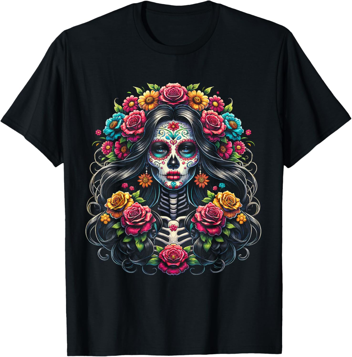 Sure to be a hit on Halloween or day of the dead celebrate in style with this cute La Catrina floral sugar skull top for women. Makes a great Dia De Muertos party top. Share your love of day of the dead with this floral sugar skull Dia De Muertos.