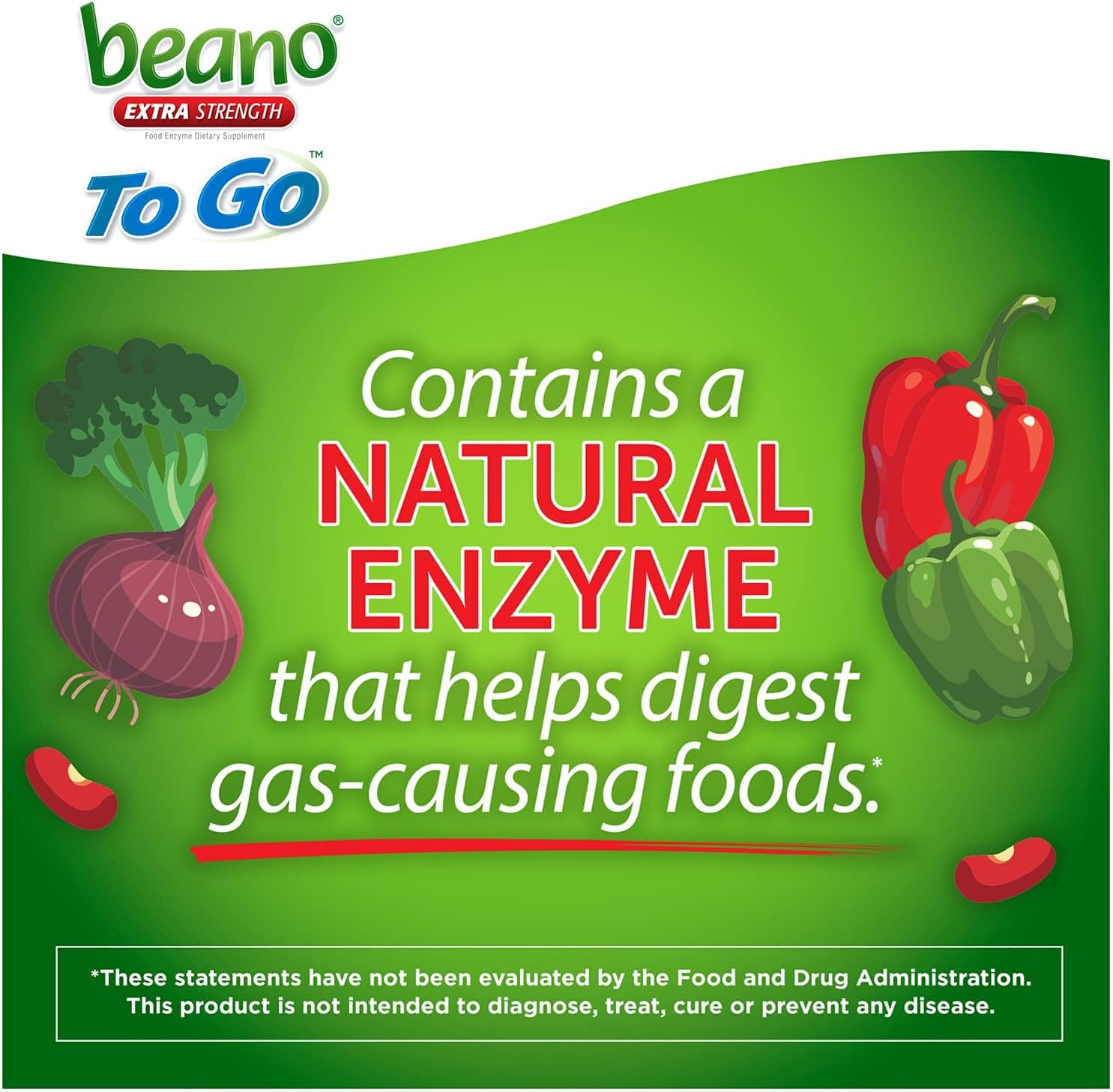 Beano To Go tablets contain a natural enzyme to help prevent gas, bloating and discomfort from beans, vegetables, whole grains and other hard-to-digest foods.