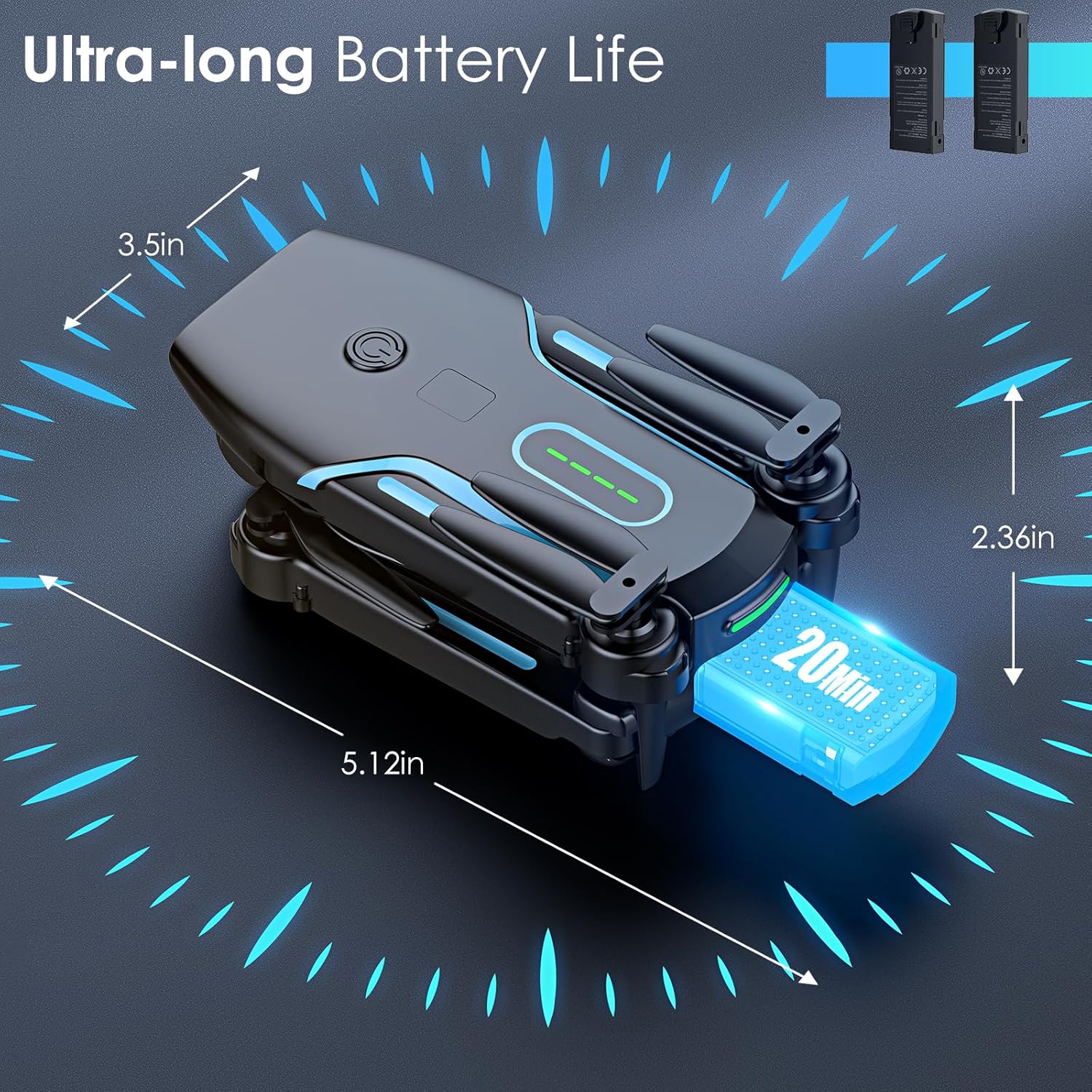Safe and Long Battery Life: The drone comes with two rechargeable drone batteries, extending the flight time of the mini drone to approximately 15-30 minutes. Fly longer without worrying about the battery. The batteries are easy to charge and replace, with built-in chips providing overvoltage protection. When the drone battery is low, the remote controller will emit a warning. Beginners no longer have to worry about losing their FPV drone.