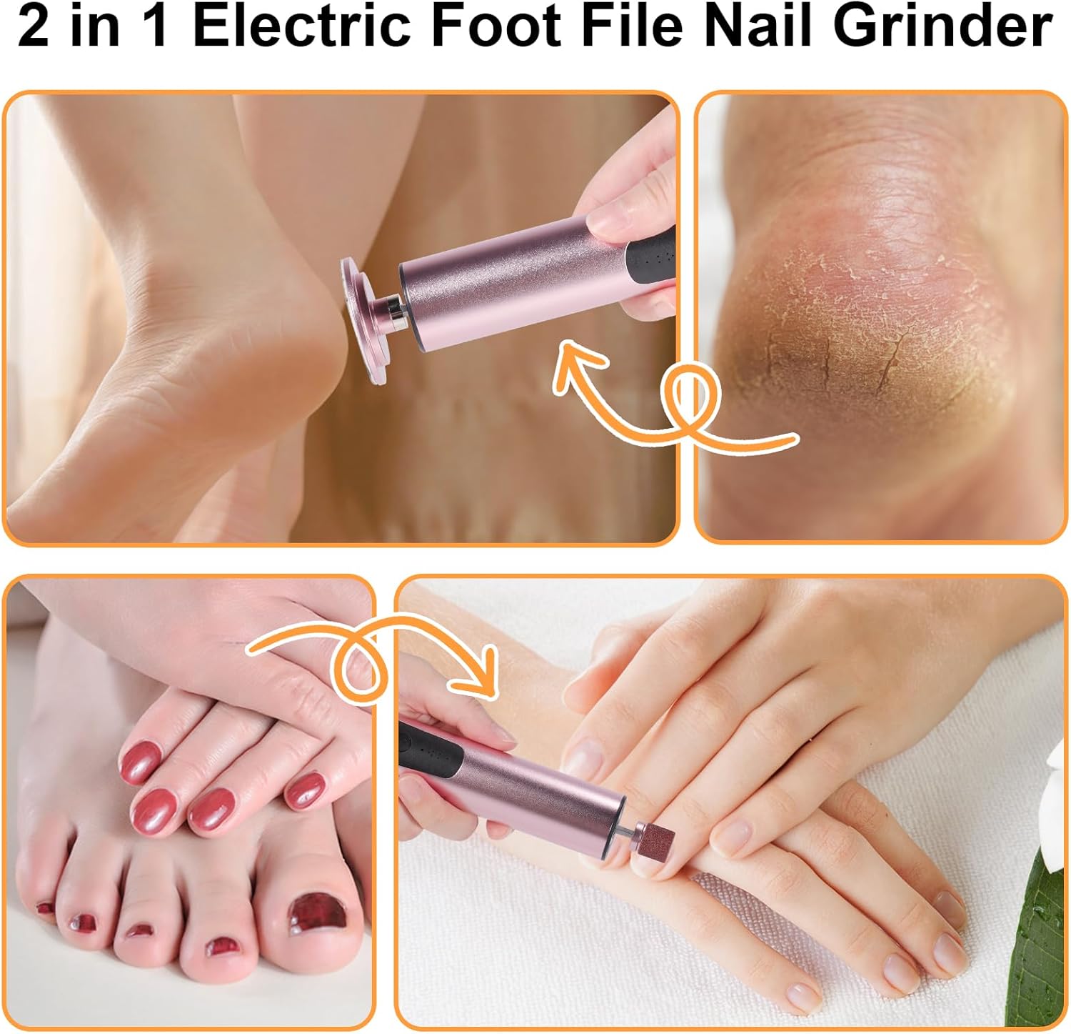 【Pedicure and Manicure Care】electric foot file its interchangeable dual heads, which enable the electric foot file to function not only as an efficient callus remover but also as a nail drill. This innovative foot callus remover tool consolidates the tasks of callus elimination and polish nails into a single, multi-purpose tool.