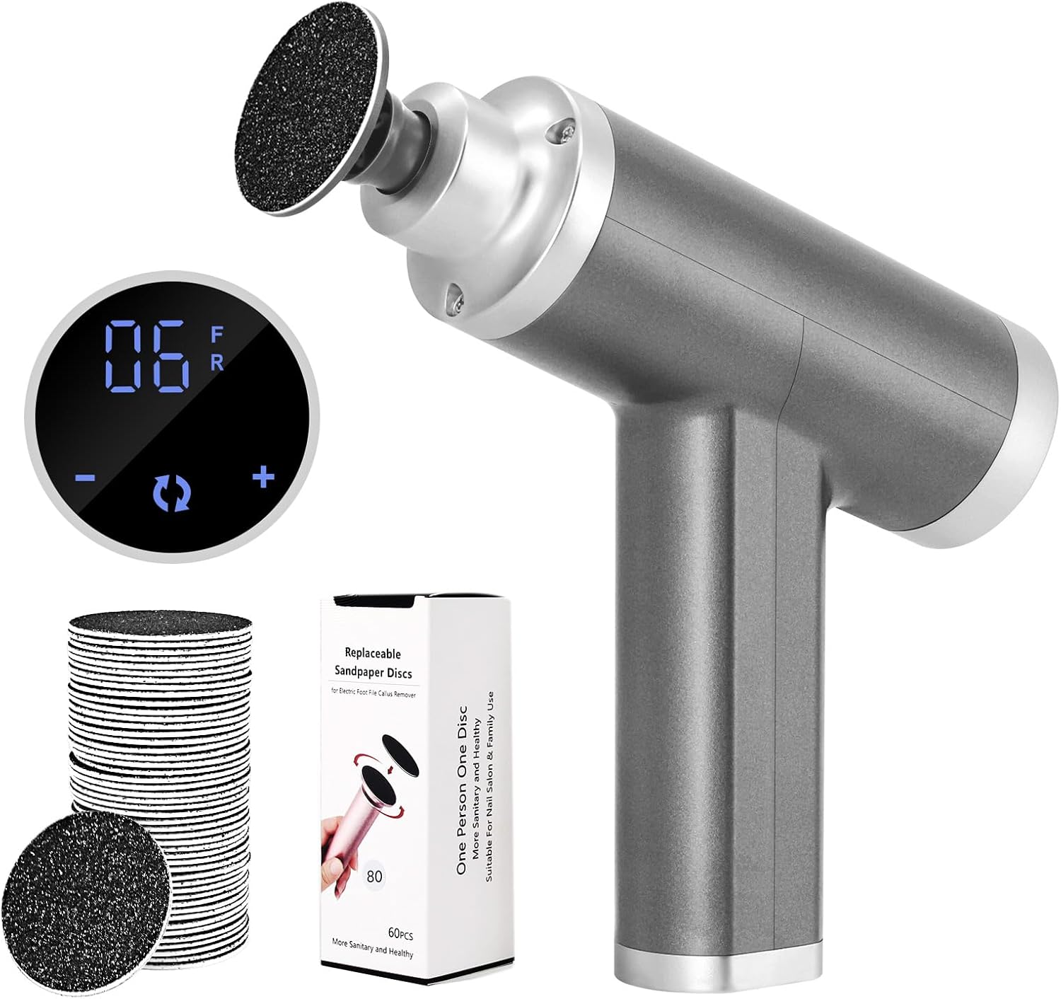 PACKAGE DETAILS: 1 x FCR-3 STARTER electric foot grinder, 1 x grinding head, 1 x box of 60 replacement sandpaper, 1 x US plug, 1 x user manual.
