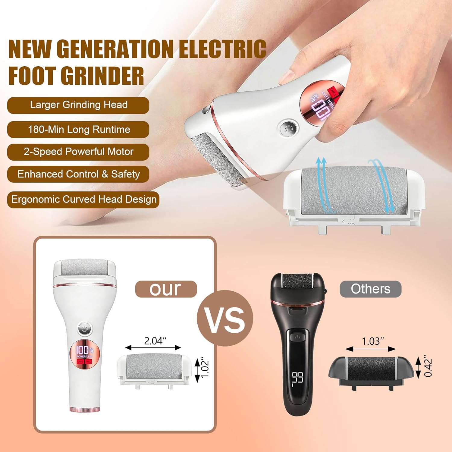 Effortlessly remove hard skin and calluses with this advanced electric foot callus remover. Featuring a larger grinding head, powerful 2-speed motor, LCD display, and up to 180 minutes of runtime, this electric feet callus remover brings spa-quality results to your home. Enjoy 1-2hour fast charging, IPX7 waterproof design, automatic drying, and a complete rechargeable pedicure kit for the ultimate foot care experience.