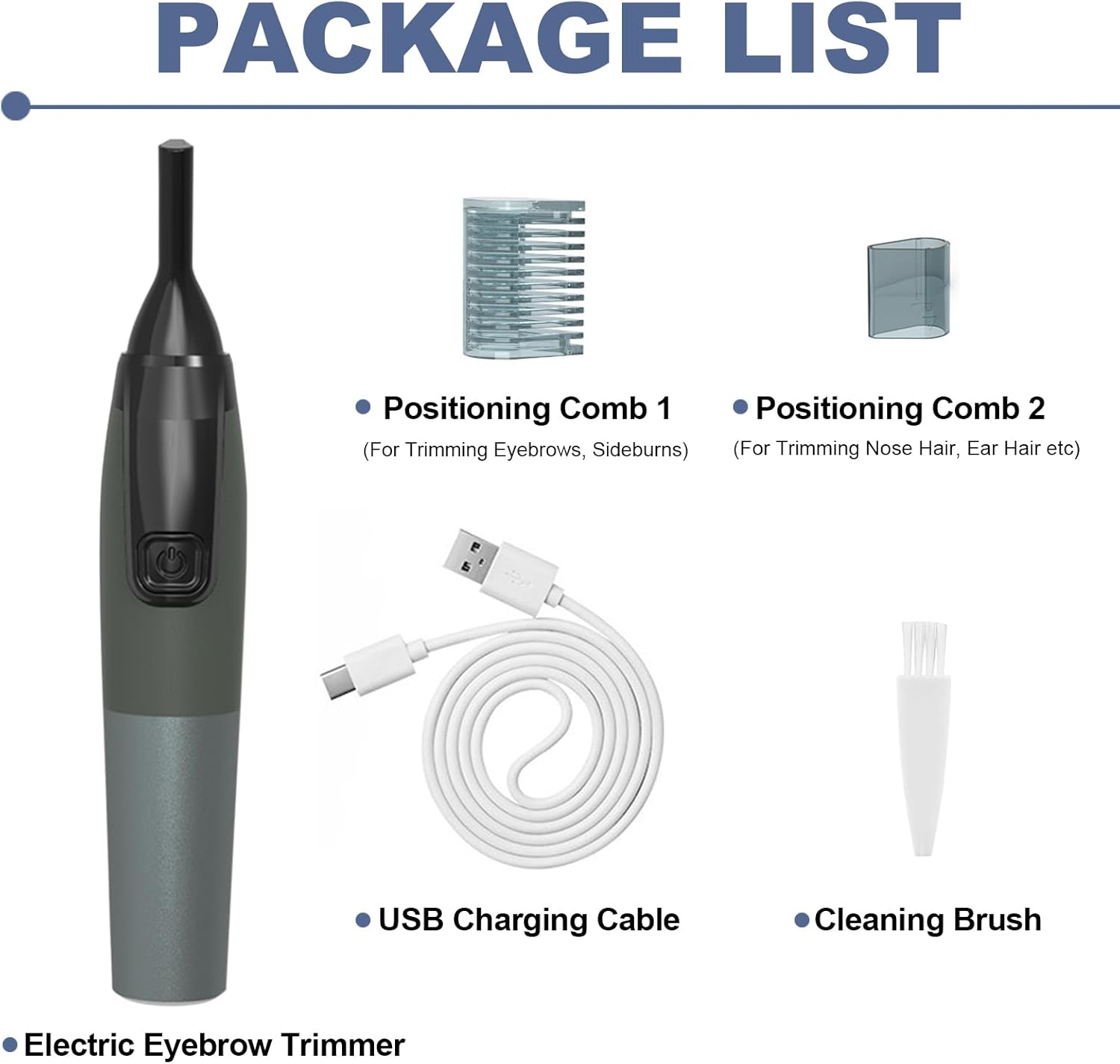 Packing List 1 x Rechargeable Eyebrow Trimmer 1 x Guide Comb 1 x Position Comb 1 x Charging Cable 1 x Cleaning Brush 1 x User Manual