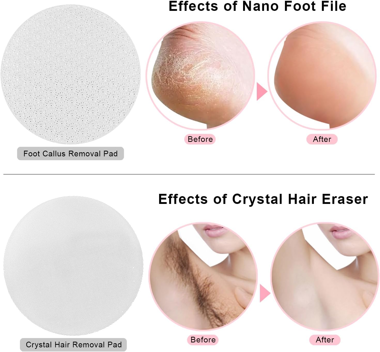 2 Different Type of Pads:1.Foot callus removal pad can remove dead skin,calluses and exfoliation on feet.2.Crystal hair removal pad can painlessly remove excess hair,such as legs,hands,chest, back,fingers and toes hairs.