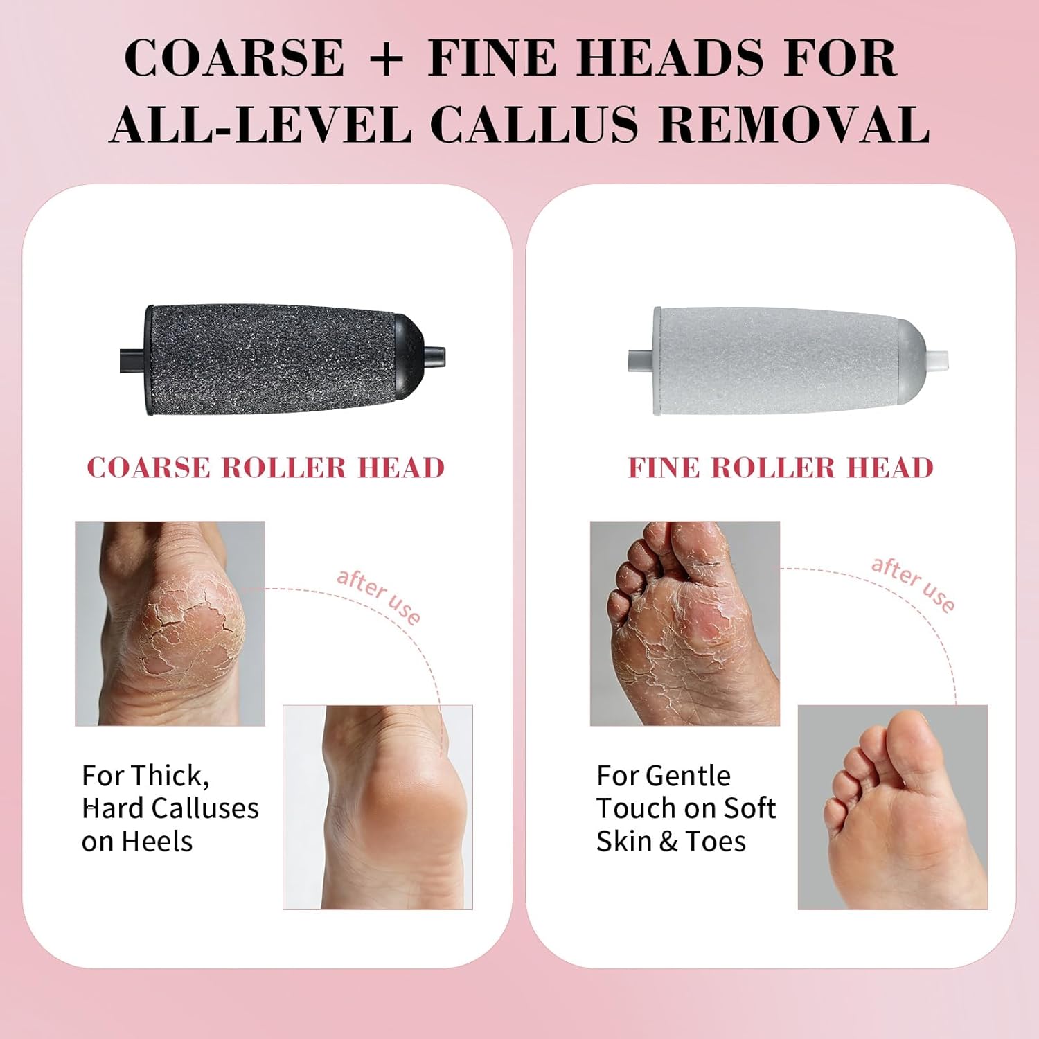 Coarse + Fine for Targeted Callus Removal: This electric callus remover for feet comes with two interchangeable roller heads for customized foot care. Coarse Head (60 grit) : Designed to tackle thick, stubborn calluses and cracked heels with heavy-duty exfoliation. Fine Head (120 grit) : Perfect for gentle buffing on sensitive areas like toes and soles, ideal for daily maintenance and finishing. As a versatile foot file, it handles everything from rough patches to delicate touch-ups with ease