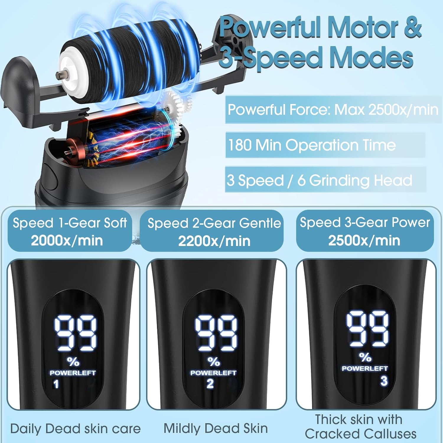 Professional 3 Speeds Adjustable: Electric foot callus remover has 3 speeds, Effortlessly toggle between Gentle/Standard/Power modes with triple-speed gear system, perfect for sensitive skin or stubborn calluses. By touching the touch button, speed switching is finished. One-touch control – no hand fatigue like manual scrapers!